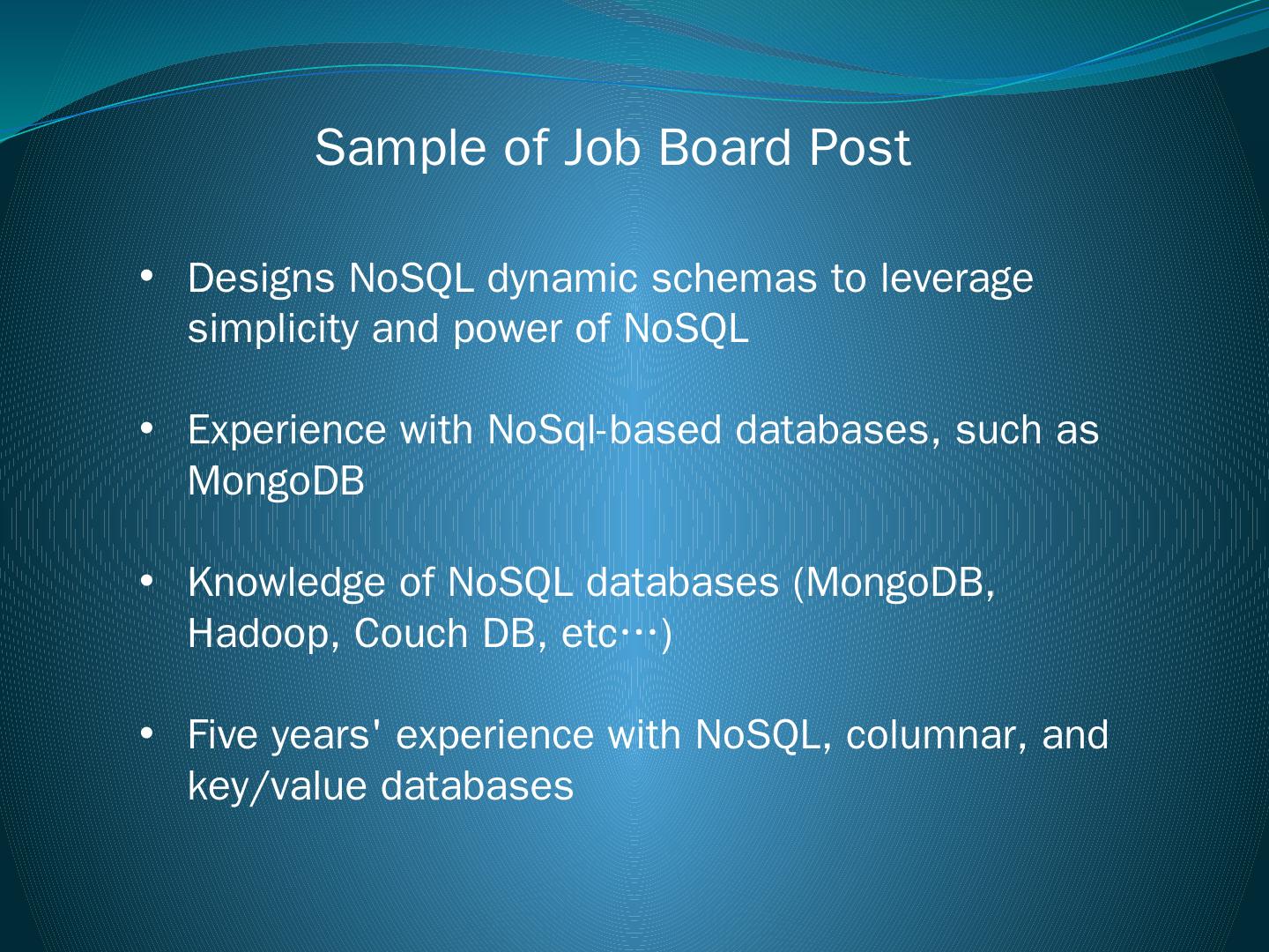 Experience with NoSql-based databases, such as MongoDB. Knowledge of NoSQL databases (MongoDB, Hadoop, Couch DB, etc…) Five years' experience ...