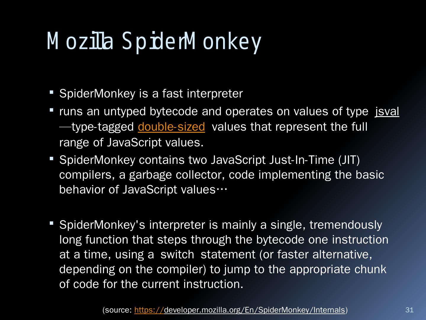 SpiderMonkey contains two JavaScript Just-In-Time (JIT) compilers, a garbage collector, code implementing the basic behavior of JavaScript values…