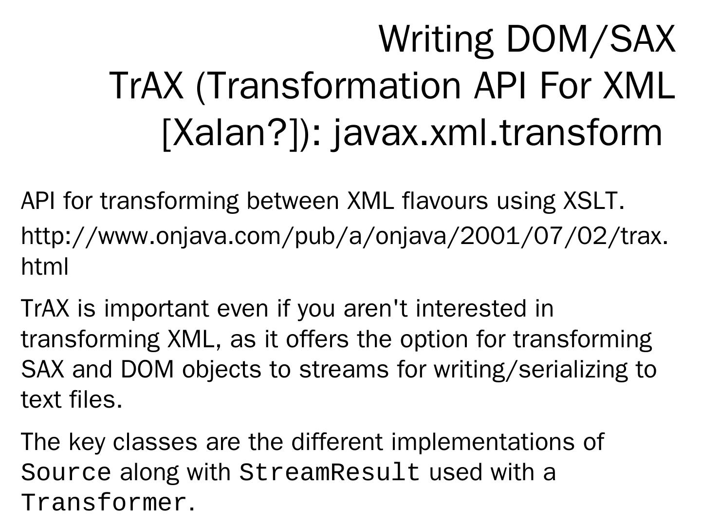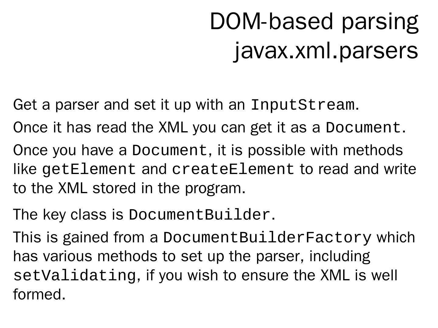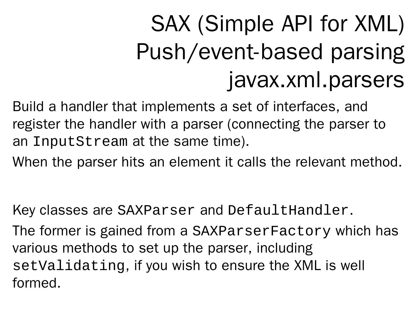 Java and XML. Couple of things we might want to do: Parse/write data as XML. Load and save objects as XML. We'll mainly discuss JAXP (Java API for XML ...