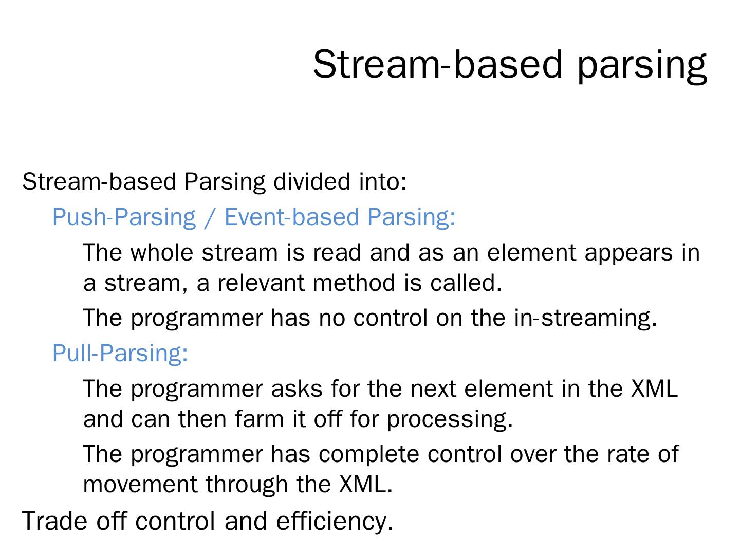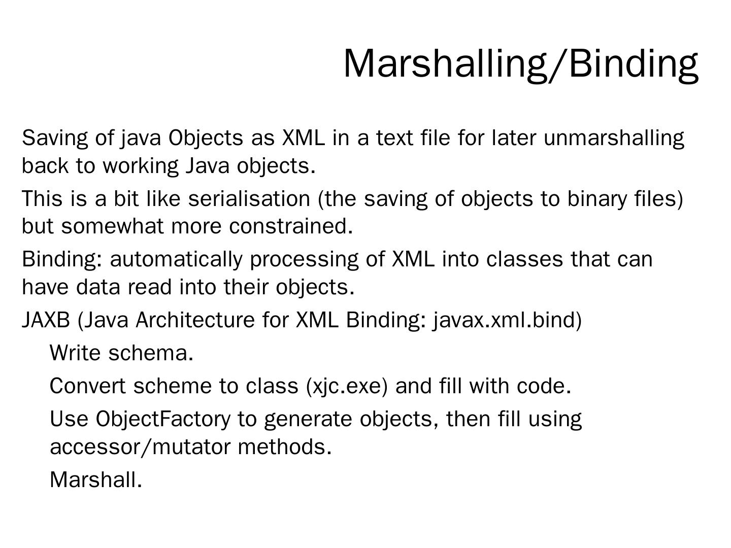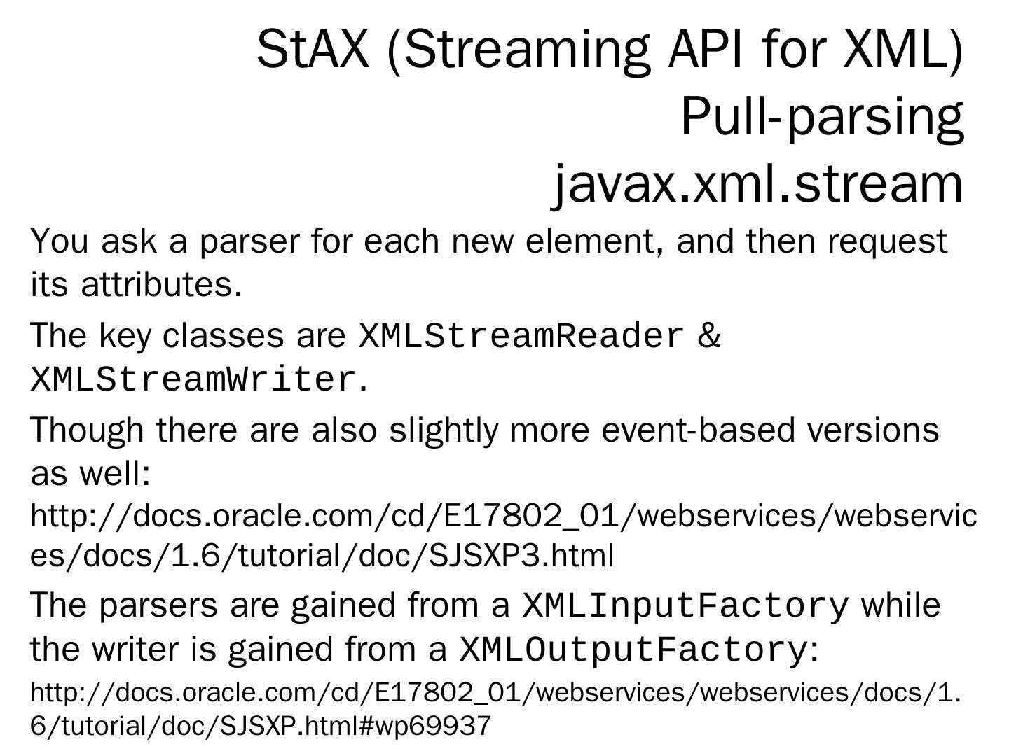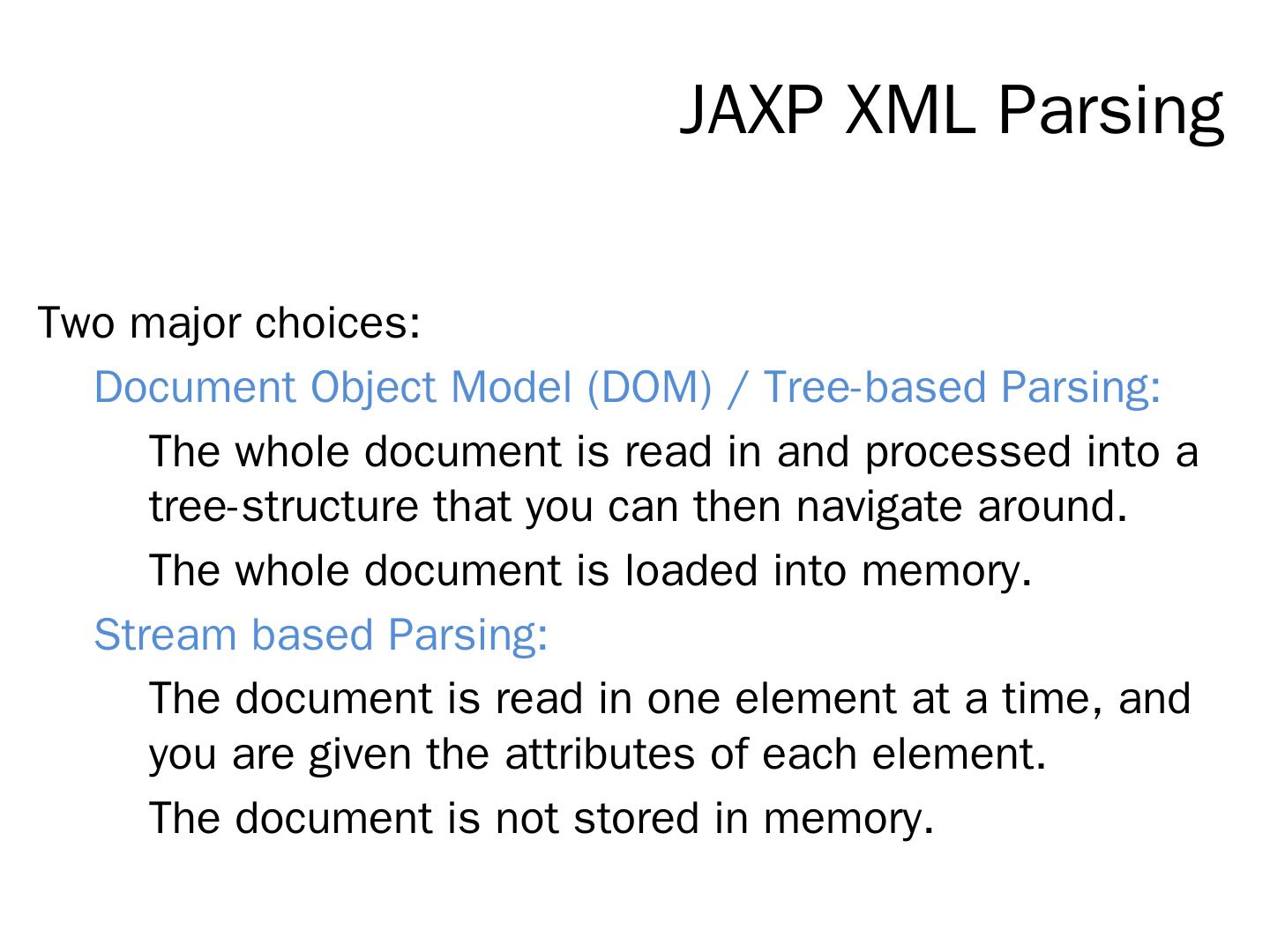Java and XML. Couple of things we might want to do: Parse/write data as XML. Load and save objects as XML. We'll mainly discuss JAXP (Java API for XML ...