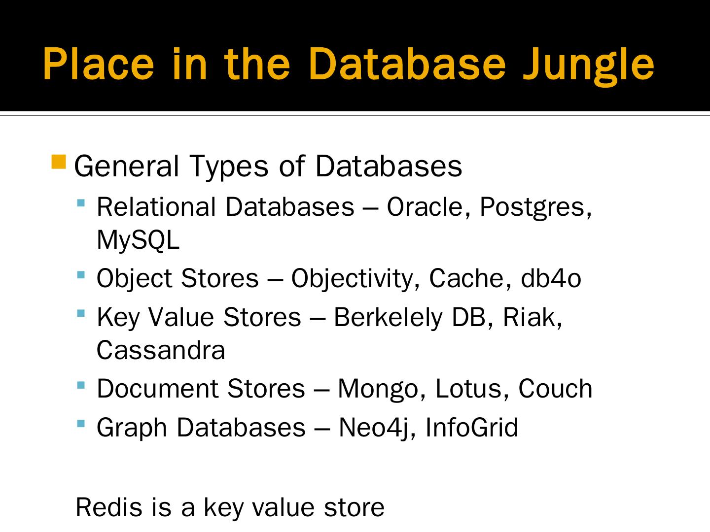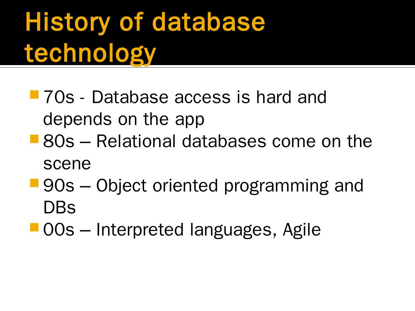 redis noelherrick.com. History of database technology. 70s - Database access is hard and depends on the app; 80s – Relational databases come on the scene ...