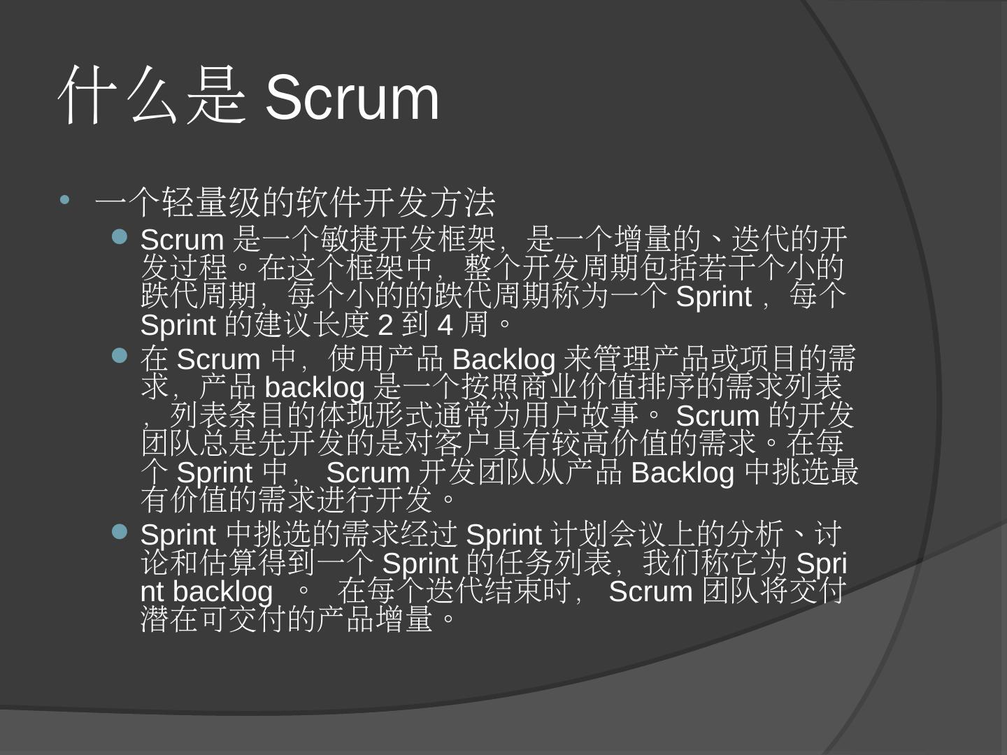 Scrum是一个敏捷开发框架,是一个增量的、迭代的开发过程。在这个框架中,整个开发周期包括若干个小的跌代周期,每个小的的跌代周期称为一个Sprint,每个Sprint ...