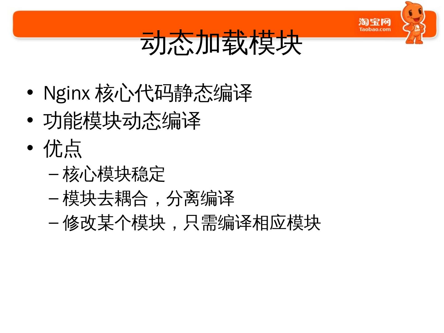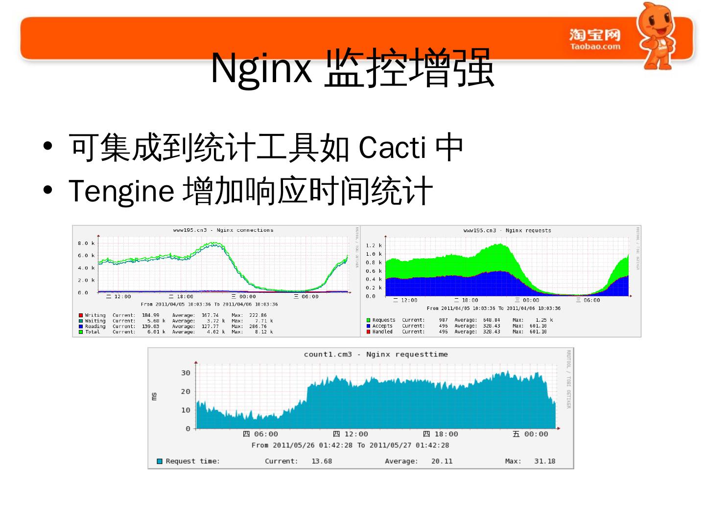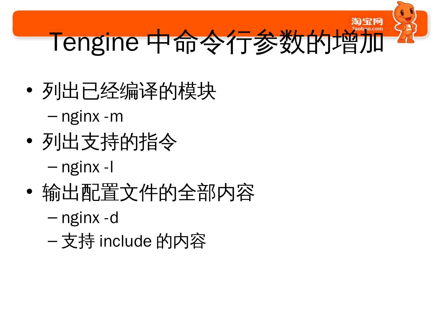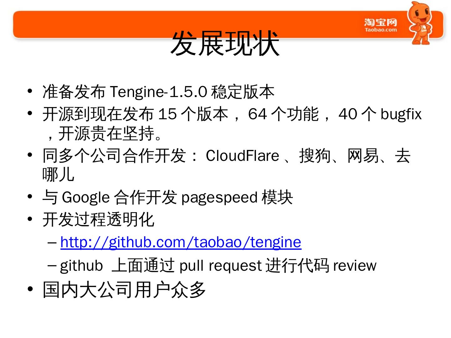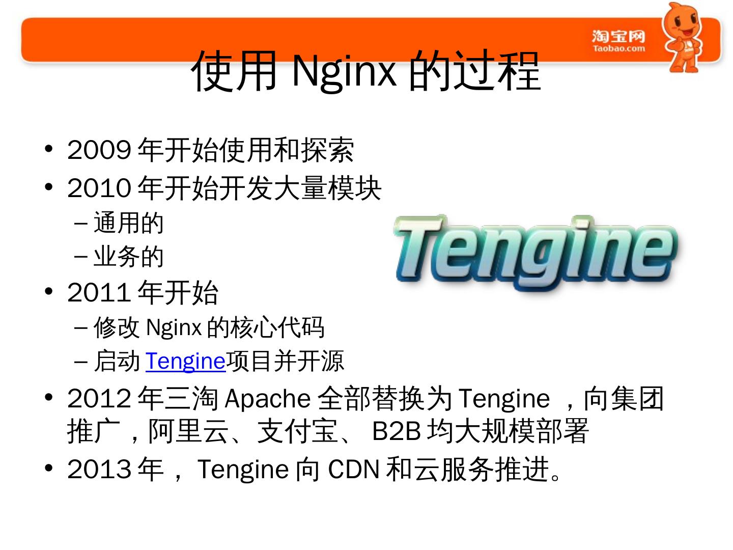 使用Nginx的过程. 2009年开始使用和探索; 2010年开始开发大量模块. 通用的; 业务的. 2011年开始. 修改Nginx的核心代码; 启动Tengine项目并开源.