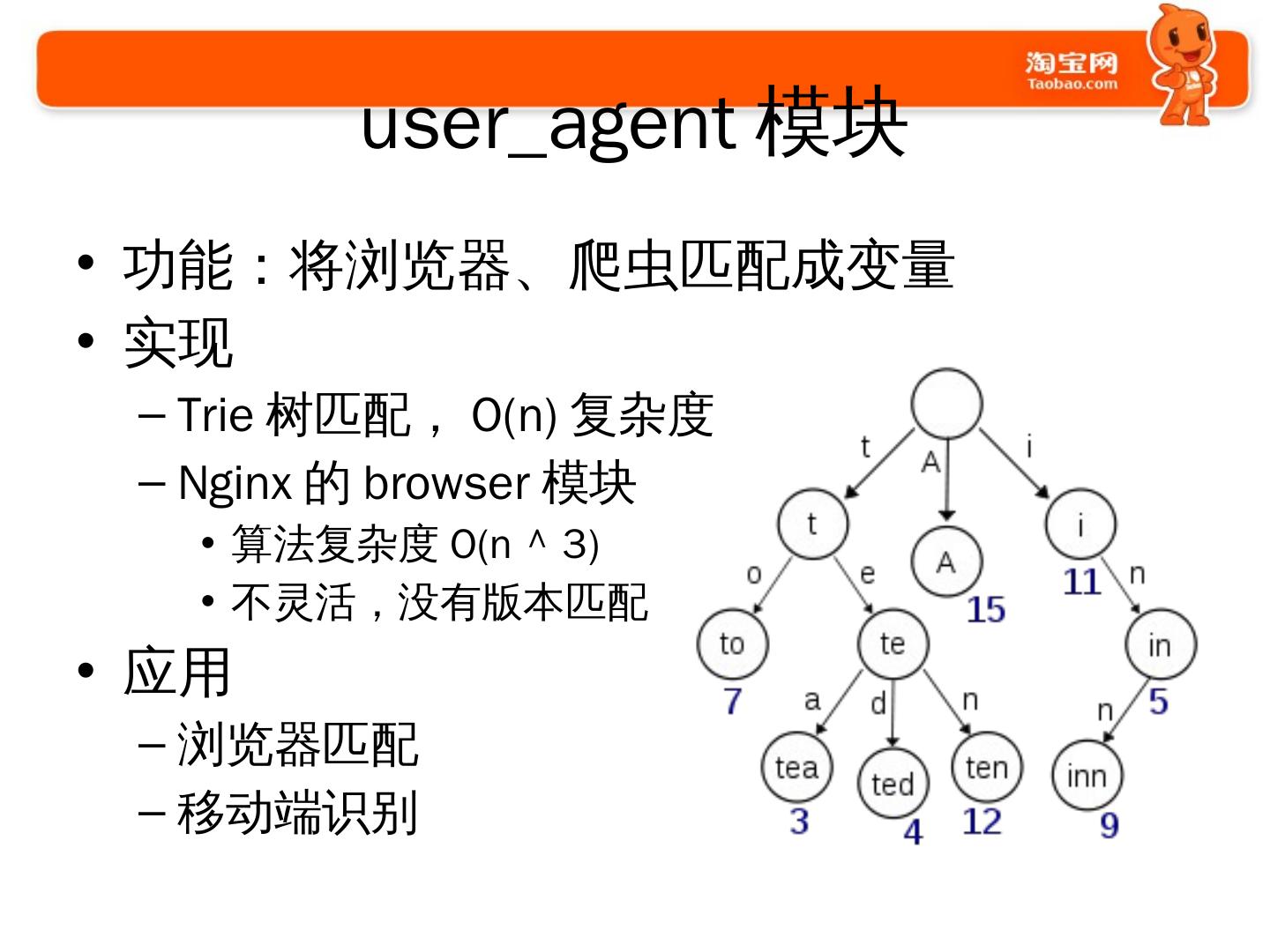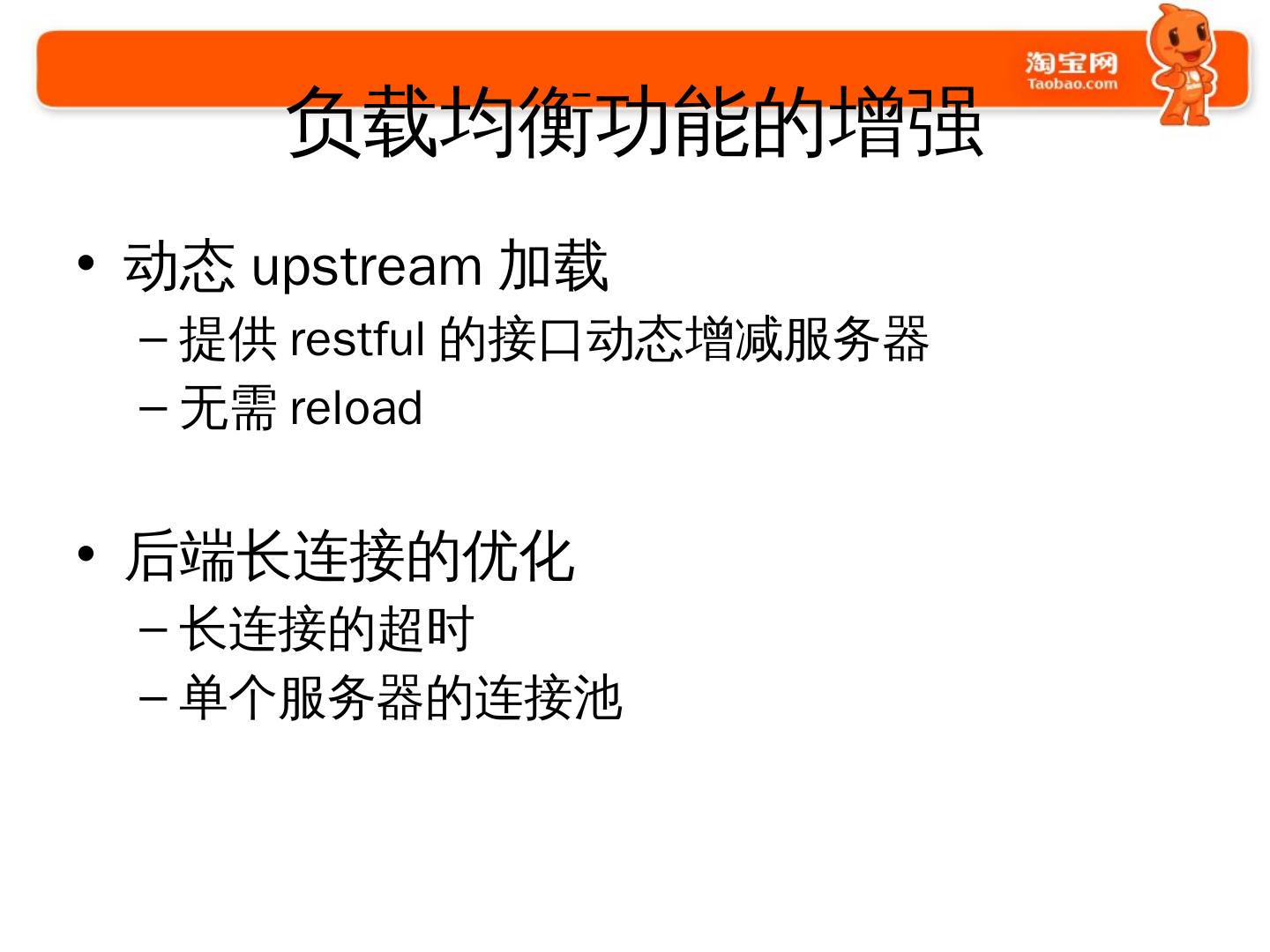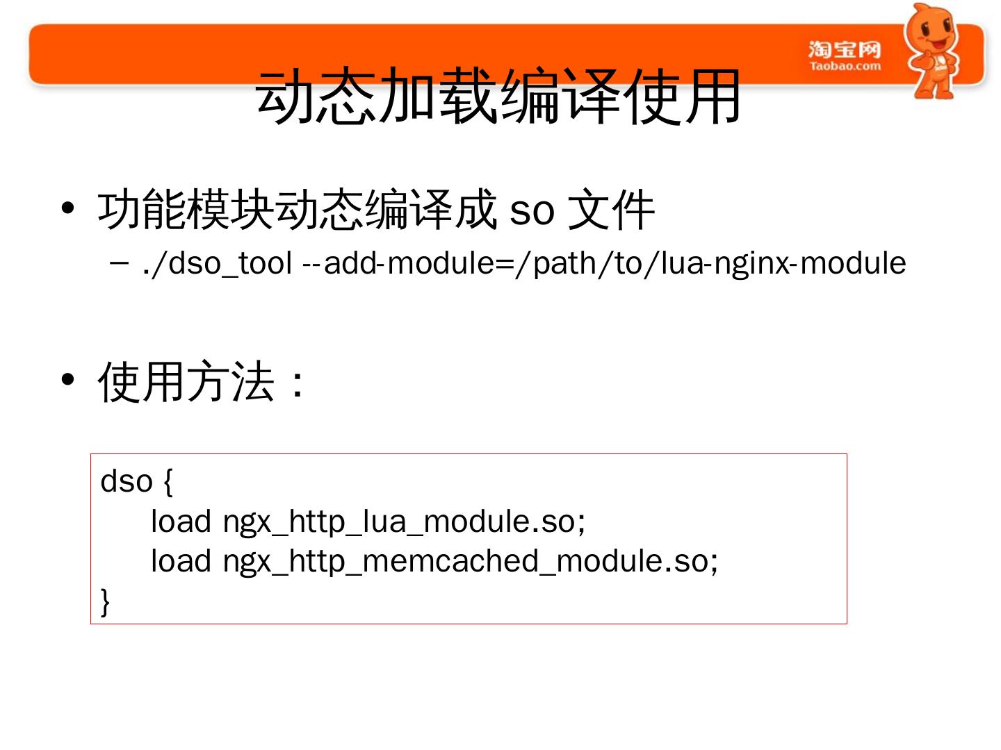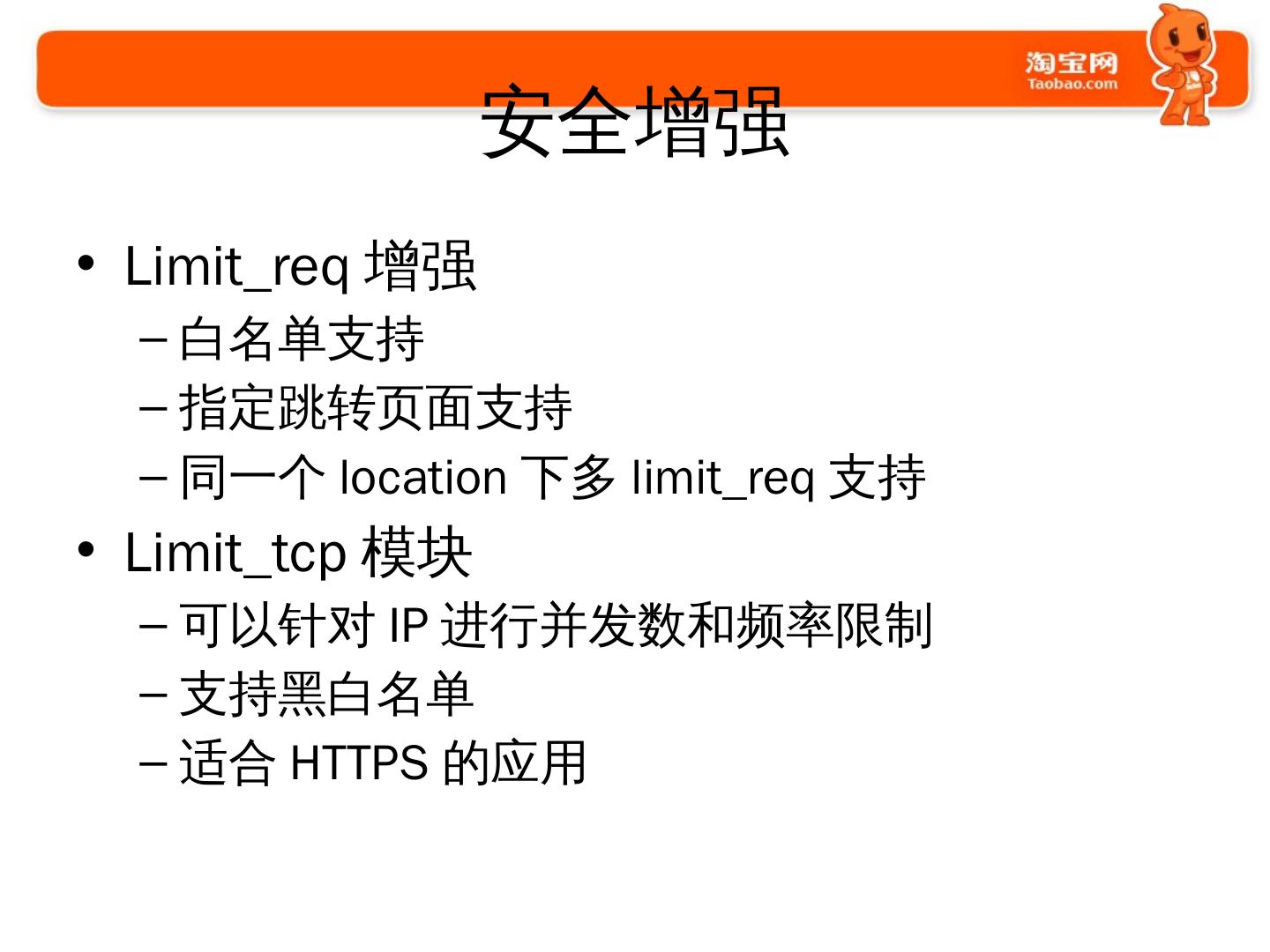 使用Nginx的过程. 2009年开始使用和探索; 2010年开始开发大量模块. 通用的; 业务的. 2011年开始. 修改Nginx的核心代码; 启动Tengine项目并开源.