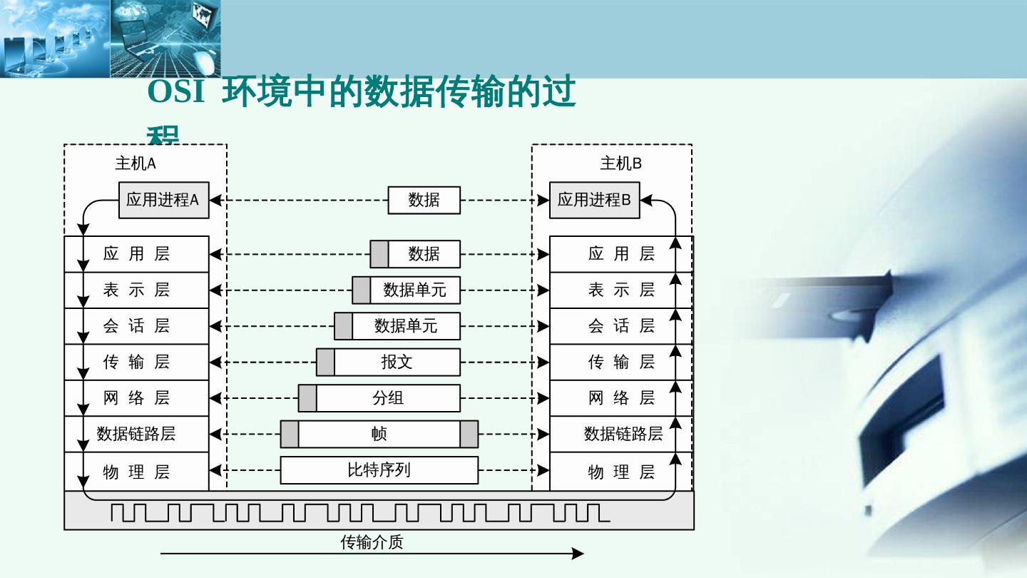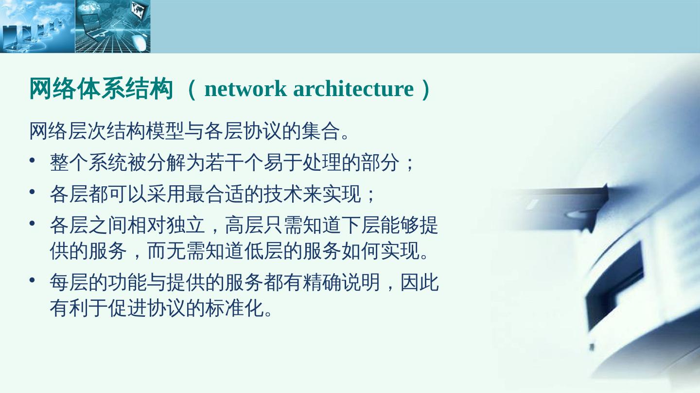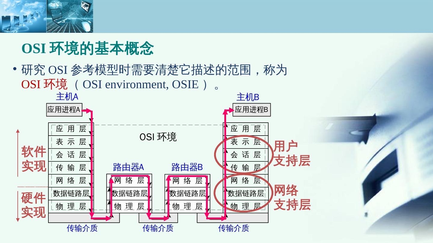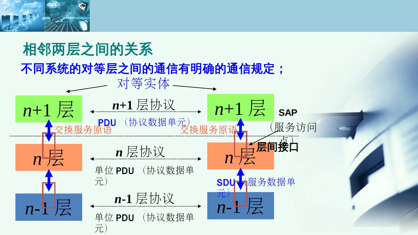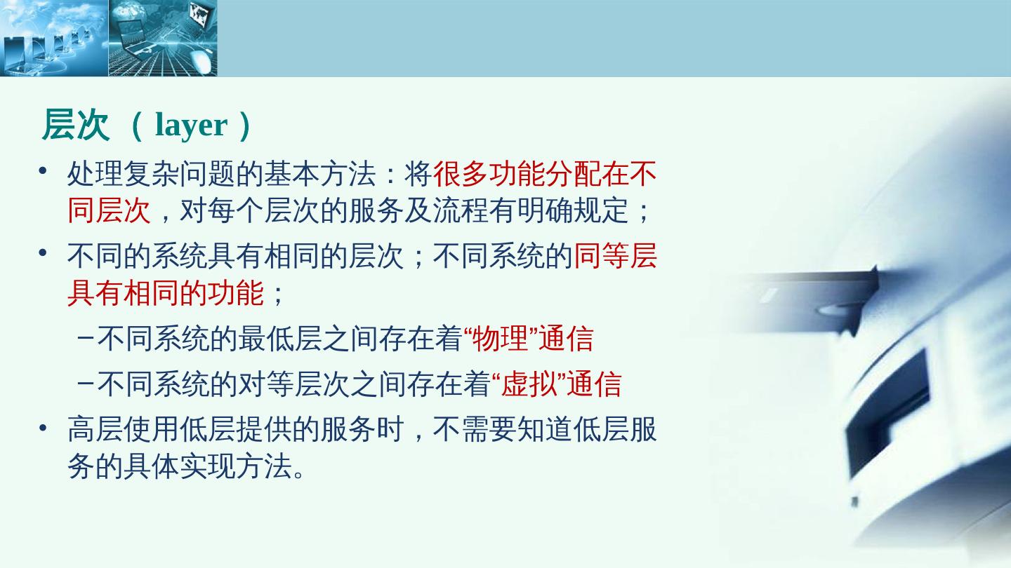 第一章 计算机网络概论 ... 邮政系统和计算机网络系统相似之处 ... 不同系统的最低层之间存在着“物理”通信; 不同系统的对等层次之间存在着“虚拟”通信; 高层使用 ... 为应用软件提供多种网络服务,例如文件服务、数据库服务、电子邮件与其它服务等。
