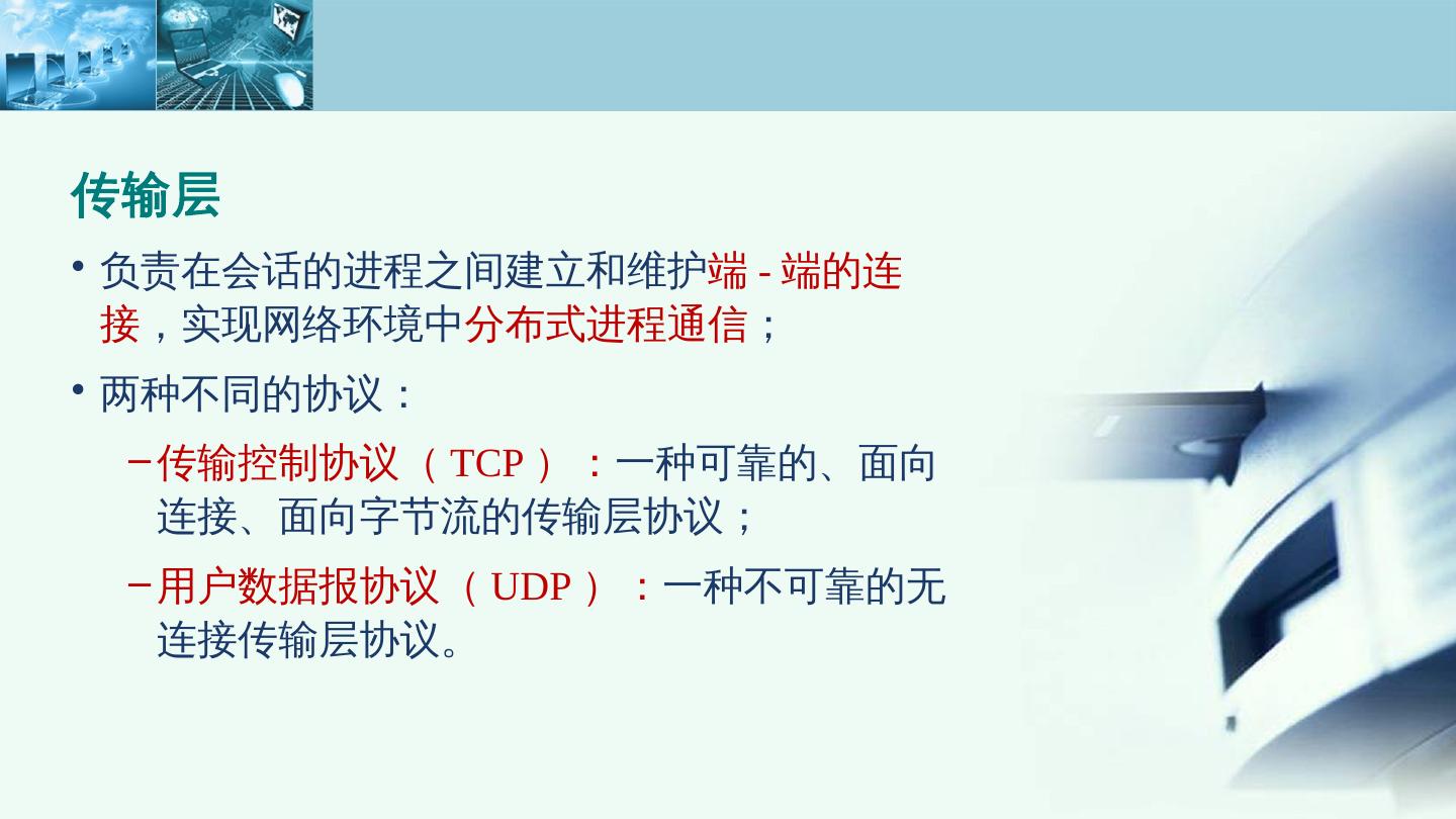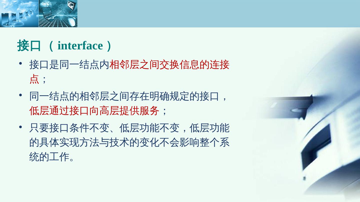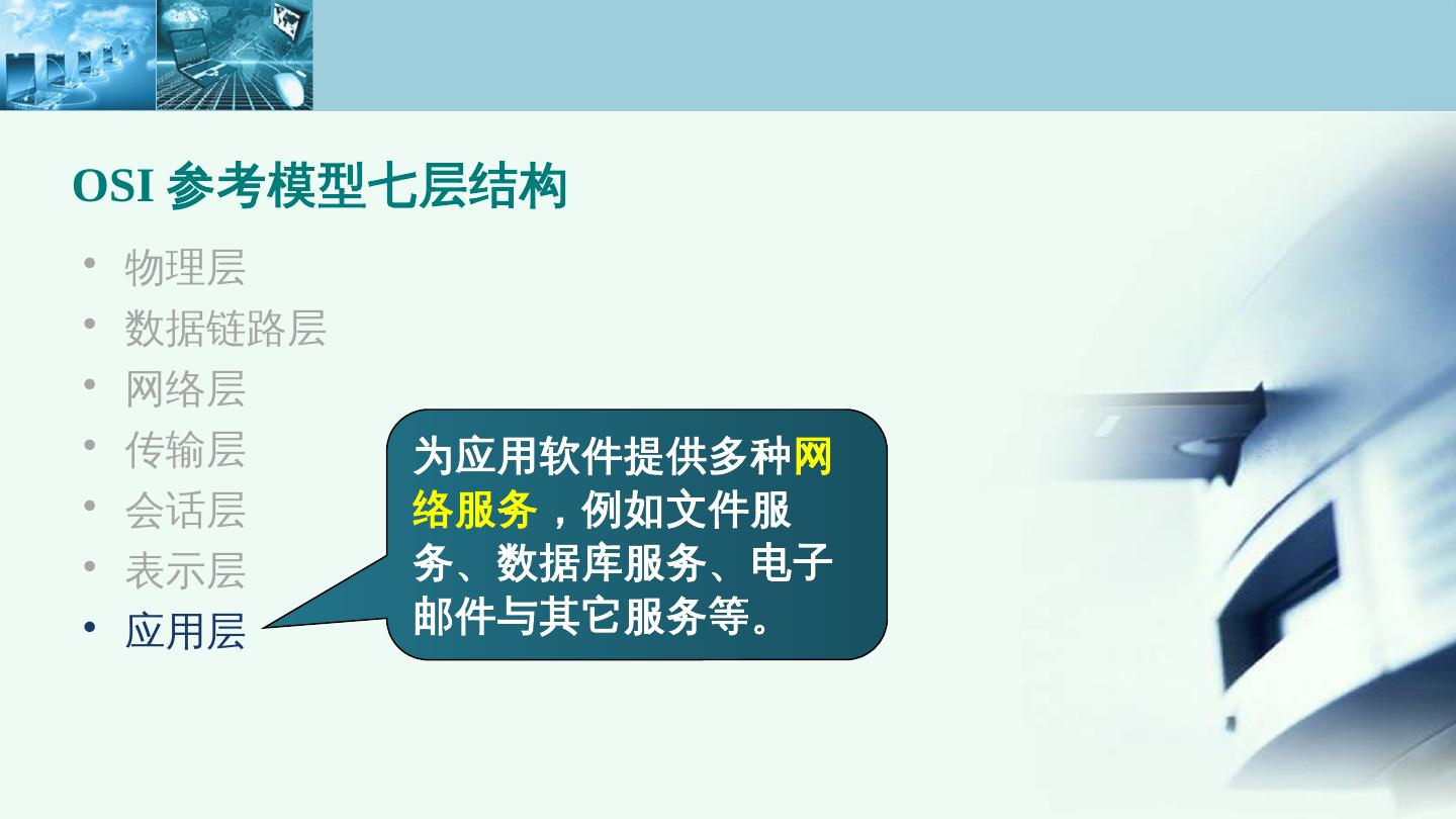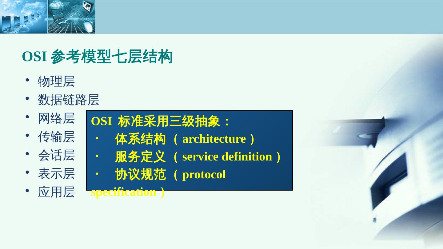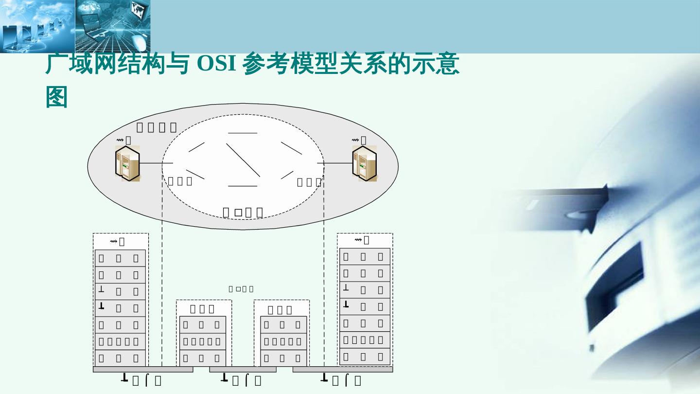 第一章 计算机网络概论 ... 邮政系统和计算机网络系统相似之处 ... 不同系统的最低层之间存在着“物理”通信; 不同系统的对等层次之间存在着“虚拟”通信; 高层使用 ... 为应用软件提供多种网络服务,例如文件服务、数据库服务、电子邮件与其它服务等。