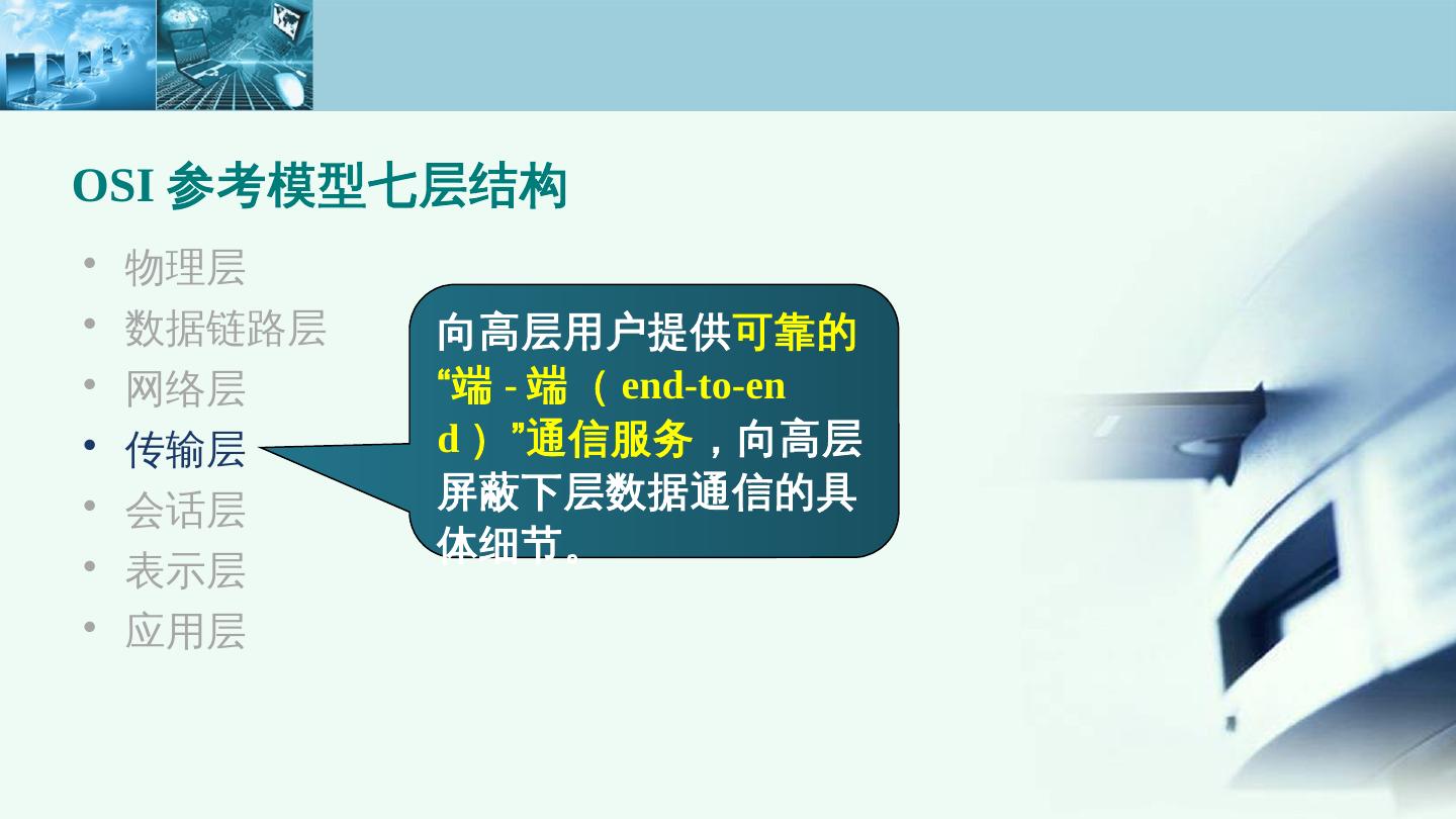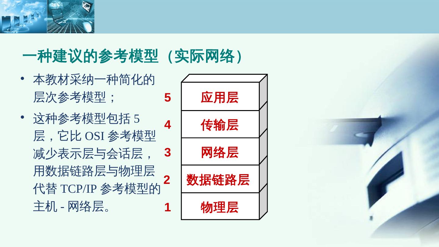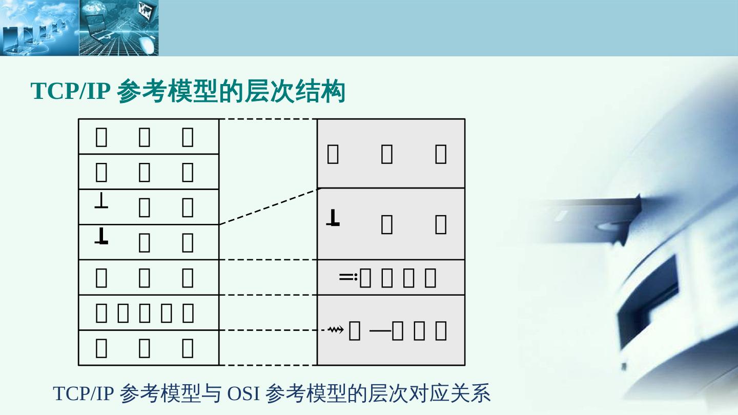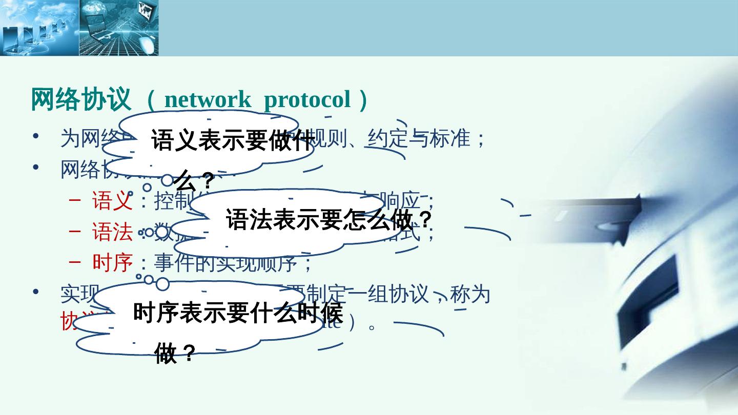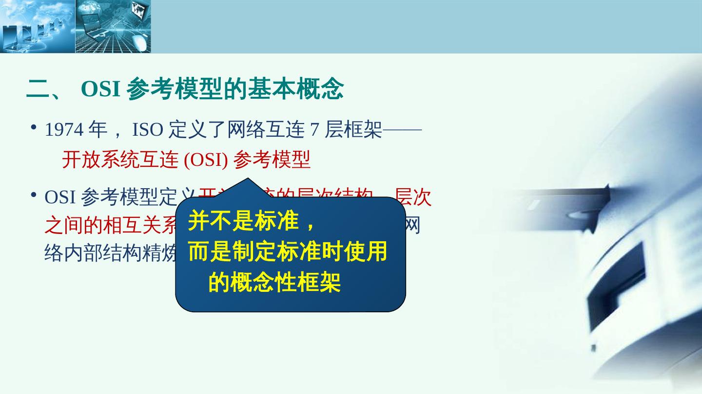 第一章 计算机网络概论 ... 邮政系统和计算机网络系统相似之处 ... 不同系统的最低层之间存在着“物理”通信; 不同系统的对等层次之间存在着“虚拟”通信; 高层使用 ... 为应用软件提供多种网络服务,例如文件服务、数据库服务、电子邮件与其它服务等。
