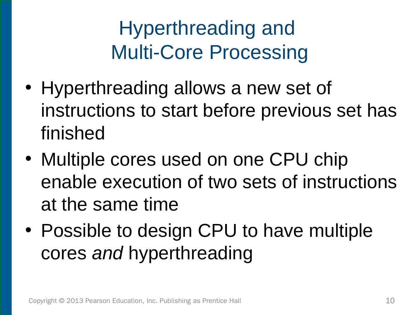 Hyperthreading allows a new set of instructions to start before previous set has finished; Multiple cores used on one CPU chip enable execution of two sets of ...