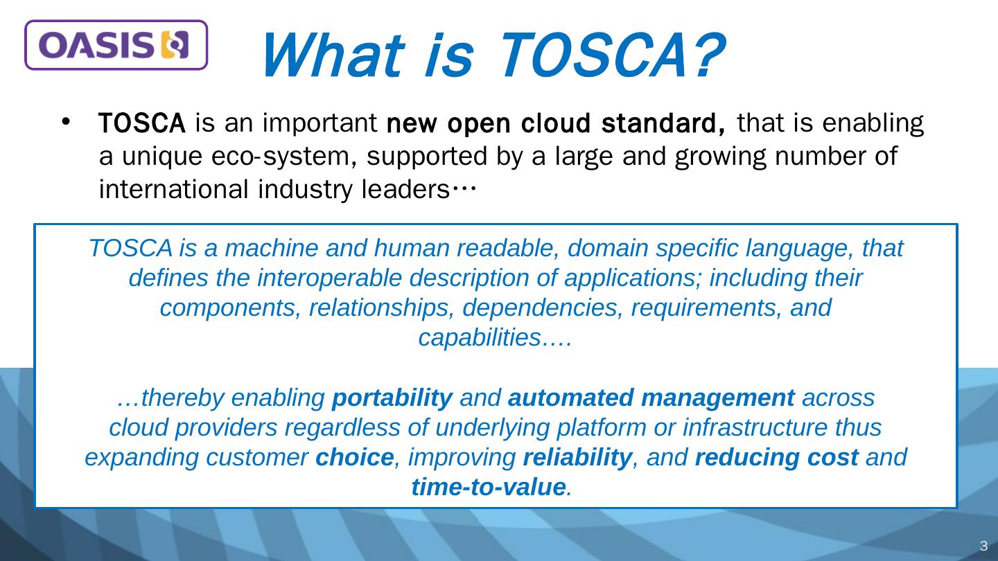 3 .TOSCA is an important new open cloud standard, that is enabling a unique eco-system, supported by a large and growing number of international industry leaders… What is TOSCA? TOSCA is a machine and human readable, domain specific language, that defines the interoperable description of applications; including their components, relationships, dependencies, requirements, and c apabilities …. …thereby enabling portability and automated management across cloud providers regardless of underlying platform or infrastructure thus expanding customer choice , improving reliability , and reducing cost and time-to-value . 3