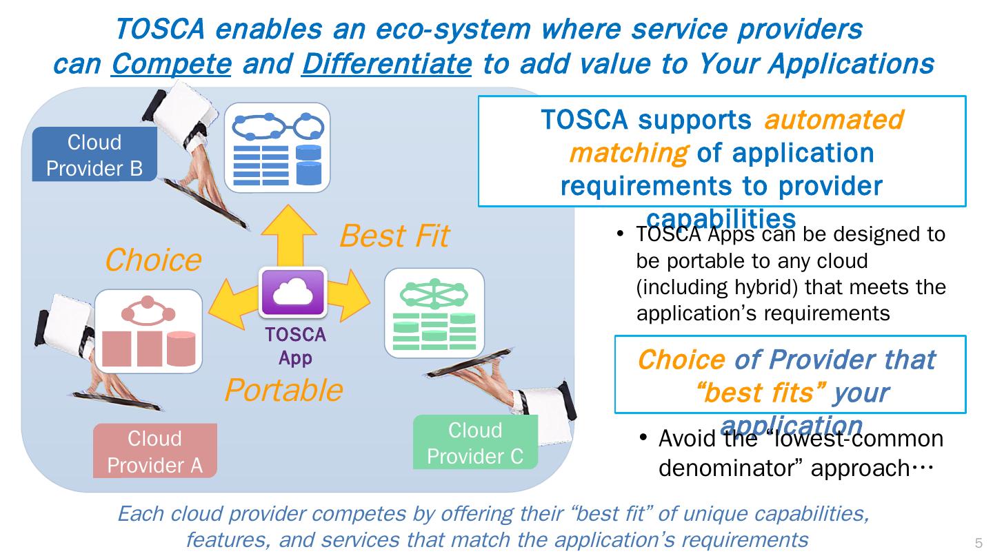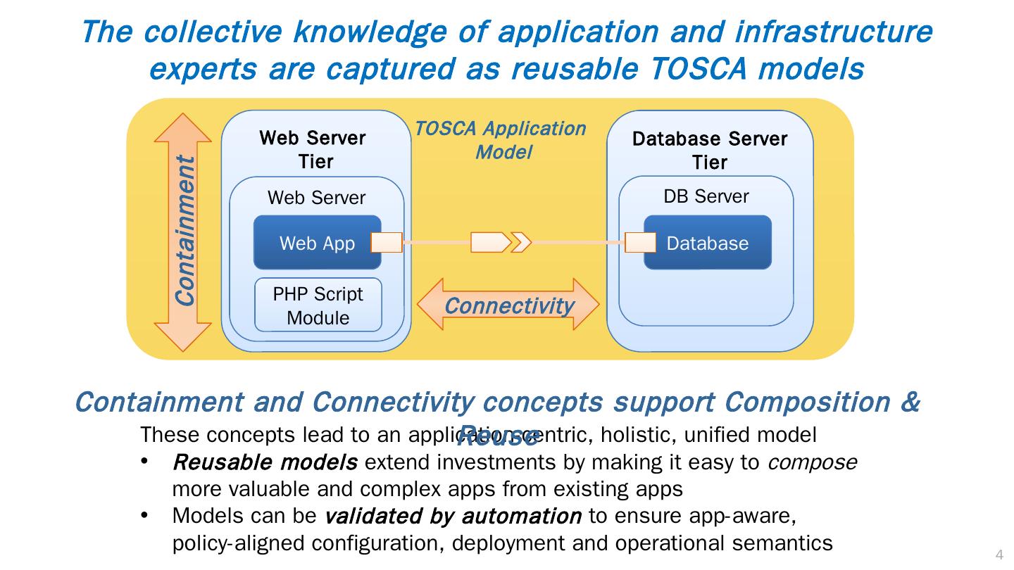 4 .4 TOSCA Application Model Web Server Tier Web Server Web App PHP Script Module Database Server Tier DB Server Database These concepts lead to an application-centric, holistic, unified model Reusable models extend investments by making it easy to compose more valuable and complex apps from existing apps Models can be validated by automation to ensure app-aware, policy-aligned configuration, deployment and operational semantics Containment and Connectivity concepts support Composition & Reuse The collective knowledge of application and infrastructure experts are captured as reusable TOSCA models Containment Connectivity