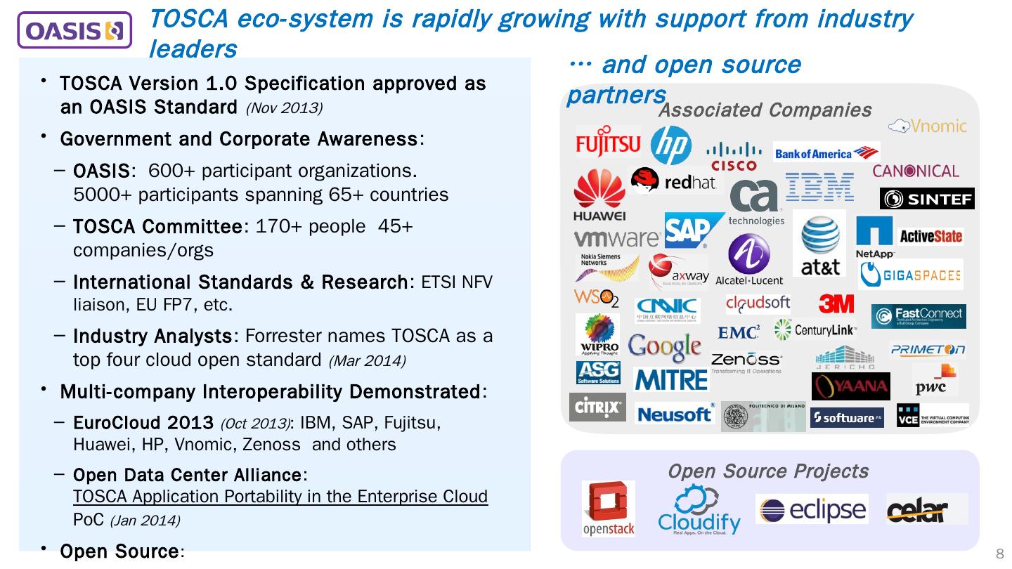 7 .7 TOSCA Portable Cloud Application TOSCA reduces application complexity Enabling TOSCA applications to be portable to different infrastructures Application Requirements TOSCA Orchestration TOSCA Service Template Storage Compute1 DB Compute2 App Network Scaling Policy Ring Network KVM KVM KVM KVM KVM KVM Cloud Provider C Cloud Provider B PowerVM SSD PowerVM SSD PowerVM SSD PowerVM SSD PowerVM PowerVM RDMA Network Cloud Provider A 10 Gb Network X86 VM HDD X86 VM HDD X86 VM Infrastructure Capabilities by expressing application requirements… independently from cloud provider Capabilities… & Optimization Automatic Matching
