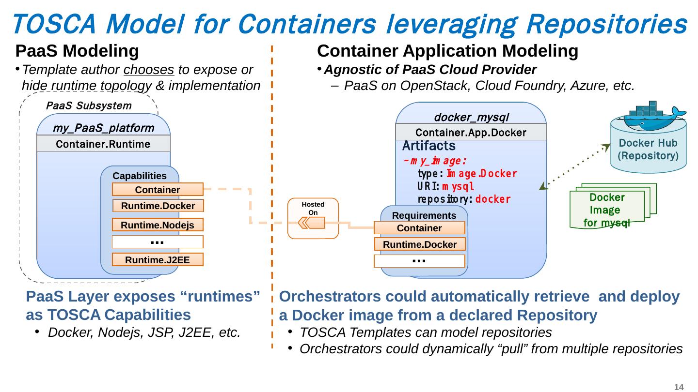 14 .TOSCA Model for Containers leveraging Repositories Hosted On PaaS Subsystem (hidden) PaaS Modeling Template author chooses to expose or hide runtime topology & implementation Container Application Modeling Agnostic of PaaS Cloud Provider PaaS on OpenStack, Cloud Foundry, Azure, etc. Docker Hub (Repository) Docker Image for mysql docker_mysql Container.App.Docker Artifacts - my_image: type: Image.Docker URI: mysql repository: docker Requirements ... Runtime.Docker Container my_PaaS_platform Container.Runtime Capabilities Runtime.Docker Container Runtime.Nodejs Runtime.J2EE ... PaaS Layer exposes “runtimes” as TOSCA Capabilities Docker, Nodejs, JSP, J2EE, etc. Orchestrators could automatically retrieve and deploy a Docker image from a declared Repository TOSCA Templates can model repositories Orchestrators could dynamically “pull” from multiple repositories