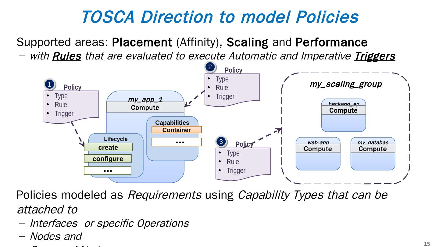 15 .Supported areas: Placement (Affinity), Scaling and Performance with Rules that are evaluated to execute Automatic and Imperative Triggers TOSCA Direction to model Policies Policies modeled as Requirements using Capability Types that can be attached to Interfaces or specific Operations Nodes and Groups of Nodes my_app_1 Compute Capabilities Container ... Lifecycle create configure ... Policy Type Rule Trigger my_scaling_group backend_app Compute Policy Type Rule Trigger my_database Compute web-app Compute Policy Type Rule Trigger 1 2 3