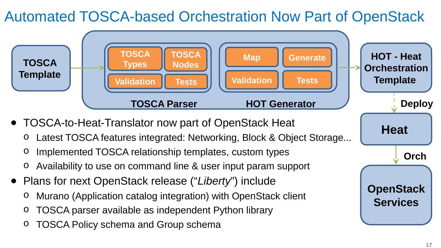 17 .Automated TOSCA-based Orchestration Now P art of OpenStack TOSCA-to-Heat-Translator now part of OpenStack Heat Latest TOSCA features integrated: Networking , Block & Object Storage... Implemented TOSCA relationship templates, custom types Availability to use on command line & user input param support Plans for next OpenStack release (“ Liberty ”) include Murano ( Application catalog integration) with OpenStack client TOSCA parser available as independent Python library TOSCA Policy schema and Group schema TOSCA Types TOSCA Template TOSCA Nodes Validation Tests Map Generate Validation Tests TOSCA Parser HOT Generator HOT - Heat Orchestration Template Heat Deploy OpenStack Services Orch