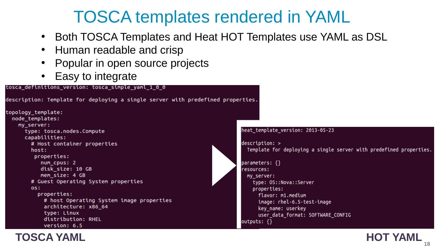 18 .TOSCA templates rendered in YAML Both TOSCA Templates and Heat HOT Templates use YAML as DSL H uman readable and crisp Popular in open source projects E asy to integrate TOSCA YAML HOT YAML