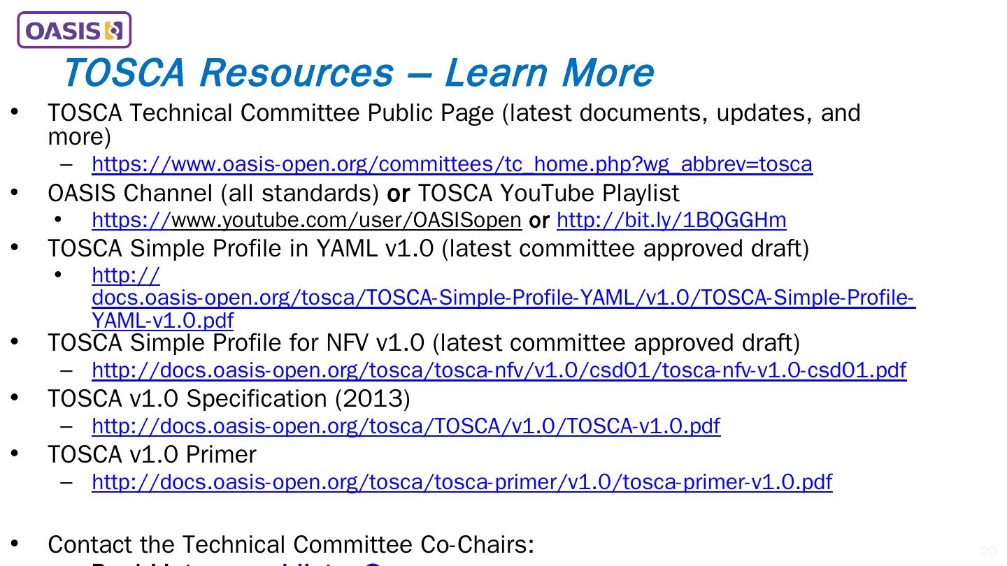 20 .TOSCA Resources – Learn More TOSCA Technical Committee Public Page (latest documents, updates, and more) https ://www.oasis-open.org/committees/tc_home.php?wg_abbrev=tosca OASIS Channel (all standards) or TOSCA YouTube Playlist https:// www.youtube.com/user/OASISopen or http://bit.ly/1BQGGHm TOSCA Simple Profile in YAML v1.0 (latest committee approved draft) http:// docs.oasis-open.org/tosca/TOSCA-Simple-Profile-YAML/v1.0/TOSCA-Simple-Profile-YAML-v1.0.pdf TOSCA Simple Profile for NFV v1.0 (latest committee approved draft) http :// docs.oasis-open.org/tosca/tosca-nfv/v1.0/csd01/tosca-nfv-v1.0-csd01.pdf TOSCA v1.0 Specification (2013 ) http ://docs.oasis-open.org/tosca/TOSCA/v1.0/TOSCA-v1.0.pdf TOSCA v1.0 Primer http ://docs.oasis-open.org/tosca/tosca-primer/v1.0/tosca-primer-v1.0.pdf Contact the Technical Committee Co-Chairs: Paul Lipton, paul.lipton@ca.com Simon Moser, smoser@de.ibm.com 20