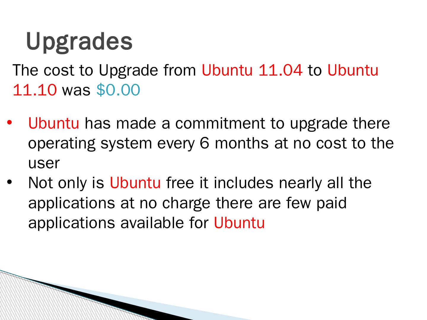 The cost to Upgrade from Ubuntu 11.04 to Ubuntu 11.10 was $0.00. Upgrading a system always has an element of risk involved. Different OSes use different ...