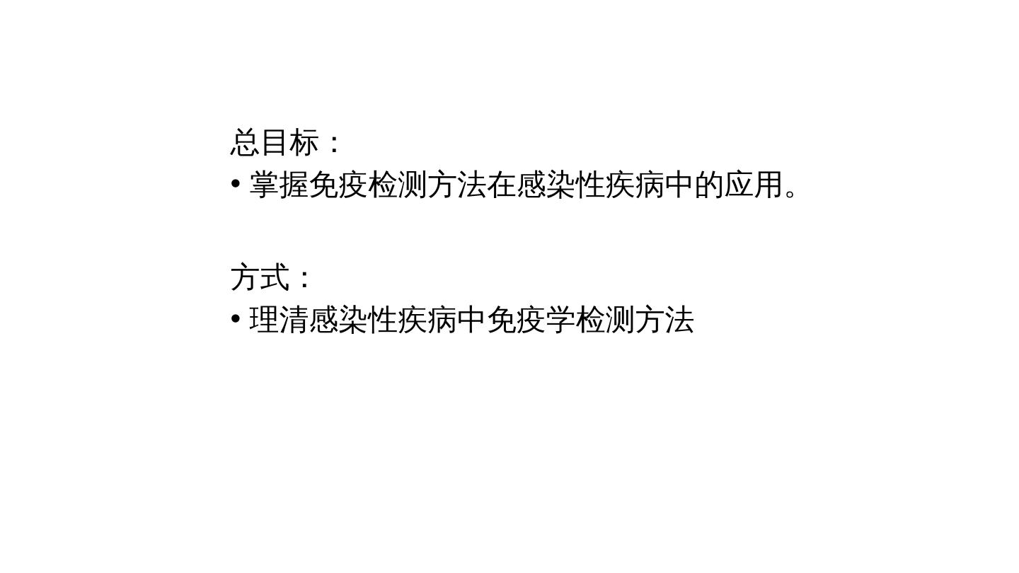 2 .总目标: 掌握免疫检测方法在感染性疾病中的应用。 方式: 理清感染性疾病中免疫学检测方法