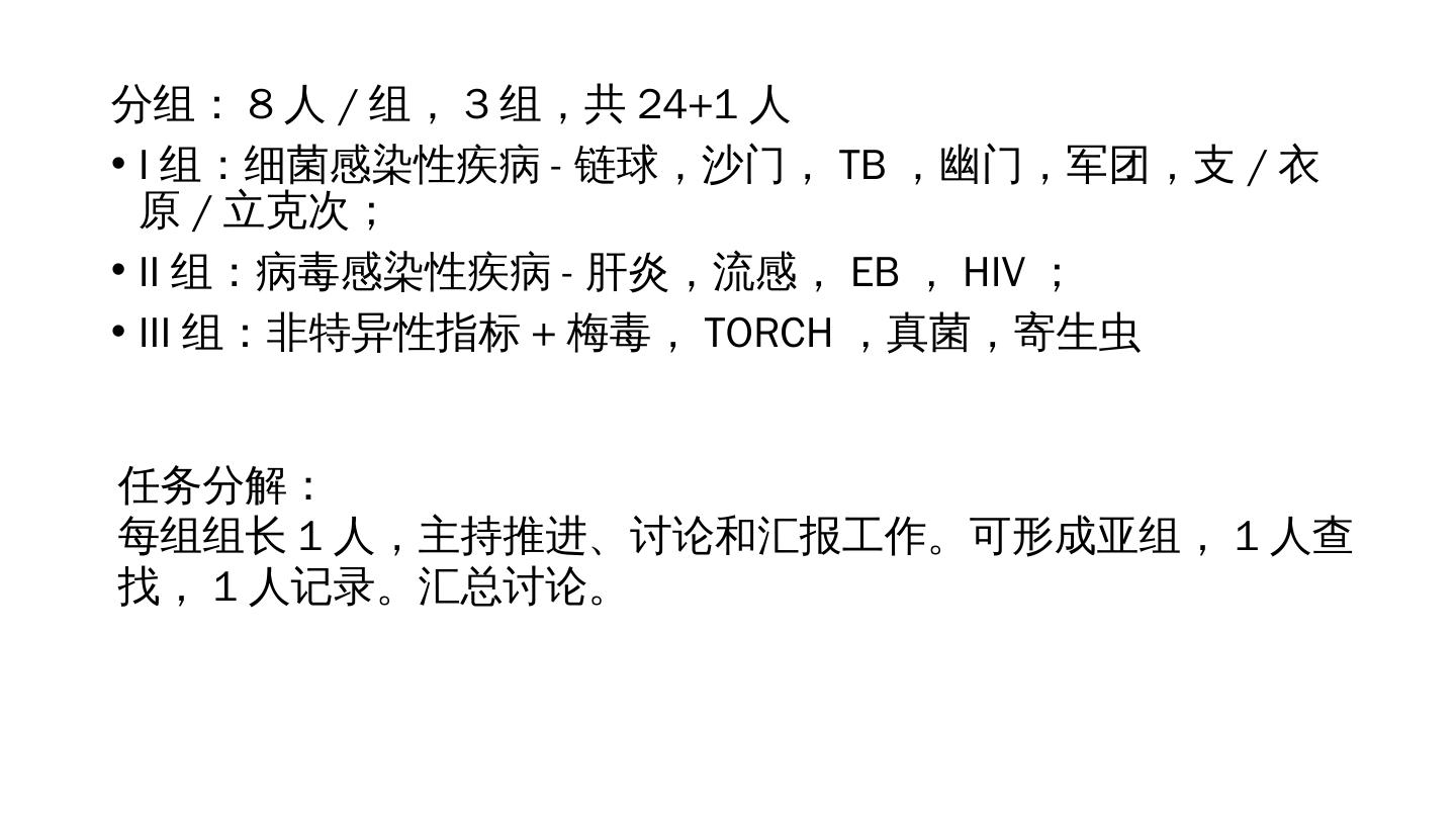 3 .分组:8人/组,3组,共24 +1 人 I组:细菌感染性疾病 - 链球,沙门, TB ,幽门,军团,支 / 衣原 / 立克次; II组:病毒感染性疾病 - 肝炎,流感, EB , HIV ; III组:非特异性指标 + 梅毒, TORCH ,真菌,寄生虫 任务分解: 每组组长1人,主持推进、讨论和汇报工作。可形成亚组,1人查找,1人记录。汇总讨论。