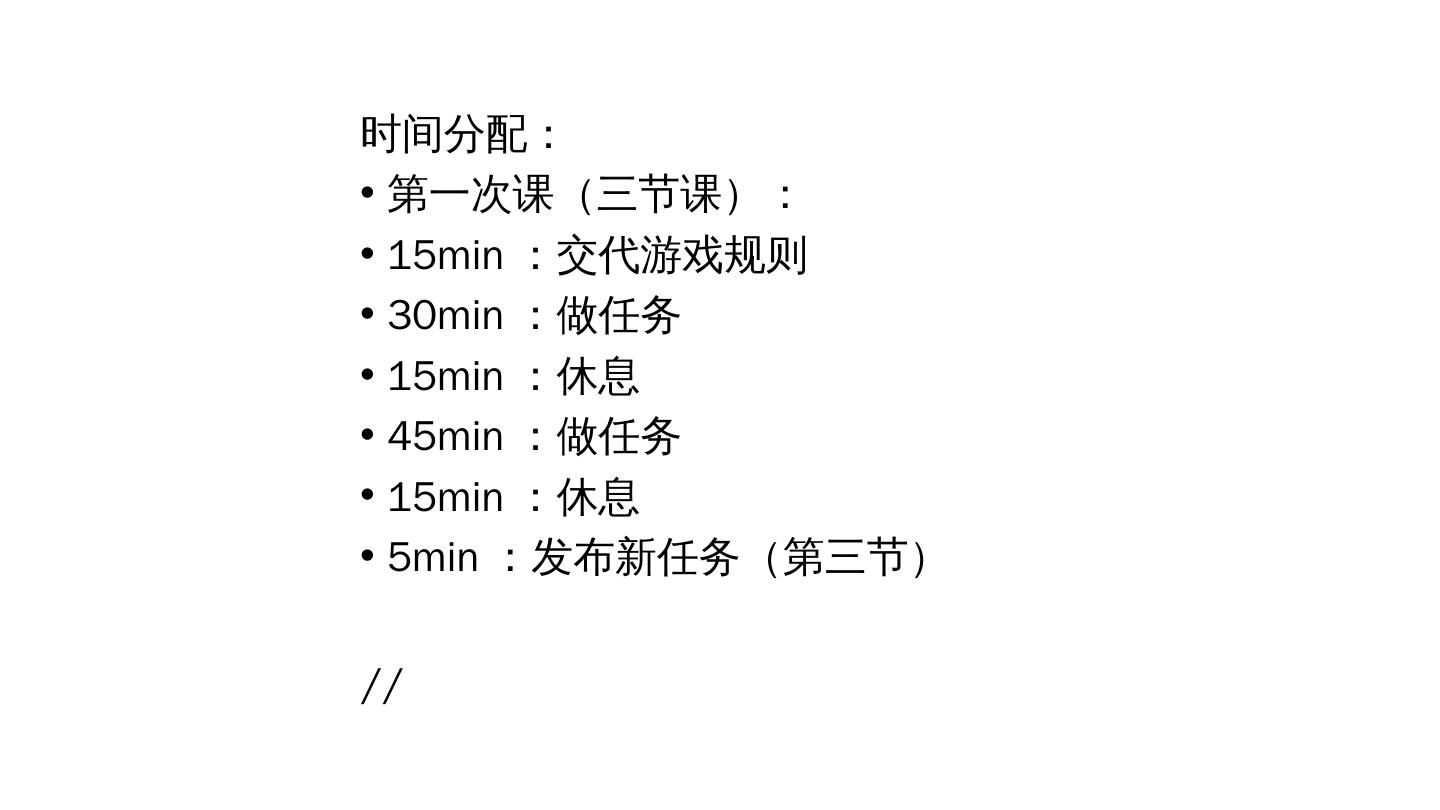 4 .时间分配: 第一次课(三节课): 15min:交代游戏规则 30min:做任务 15min:休息 45min:做任务 15min:休息 5min:发布新任务(第三节) //