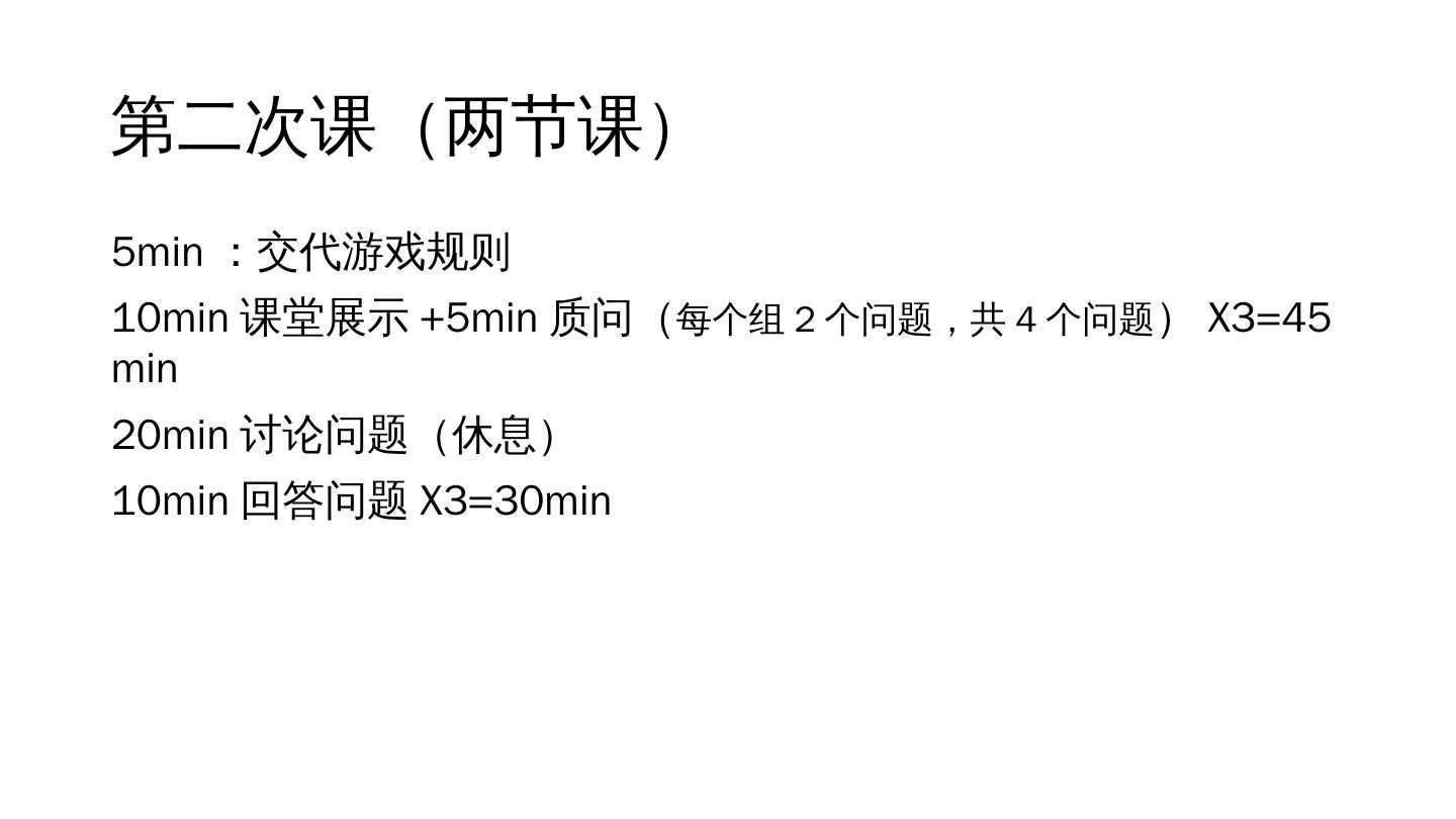 6 .第二次课(两节课) 5min:交代游戏规则 10min课堂展示+ 5 min质问( 每个组 2 个问题,共 4 个问题 )X3= 45 min 20min讨论问题(休息) 10 min回答问题X3= 30 min