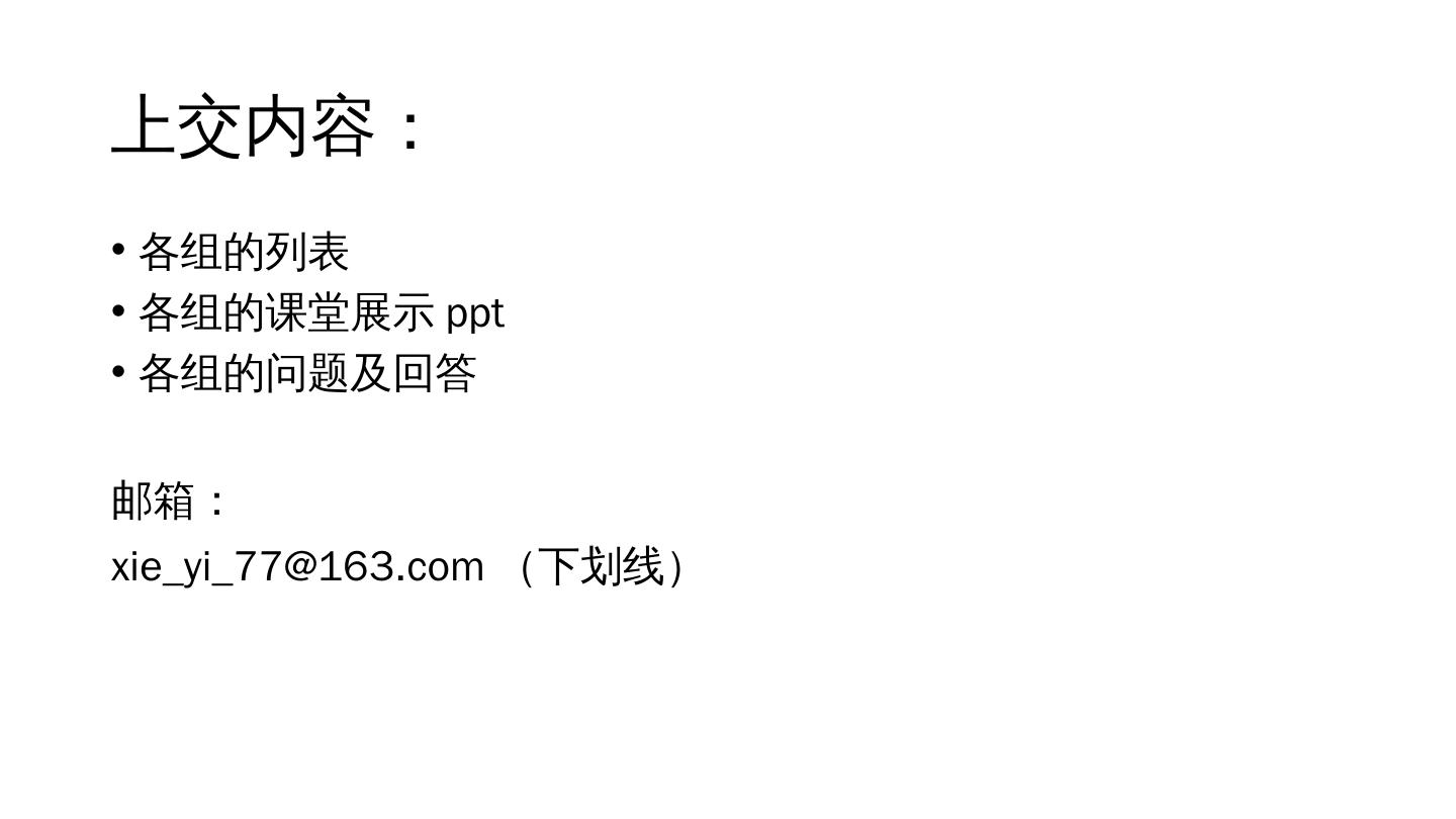 7 .上交内容: 各组的列表 各组的课堂展示 ppt 各组的问题及回答 邮箱: xie_yi_77@163.com (下划线)