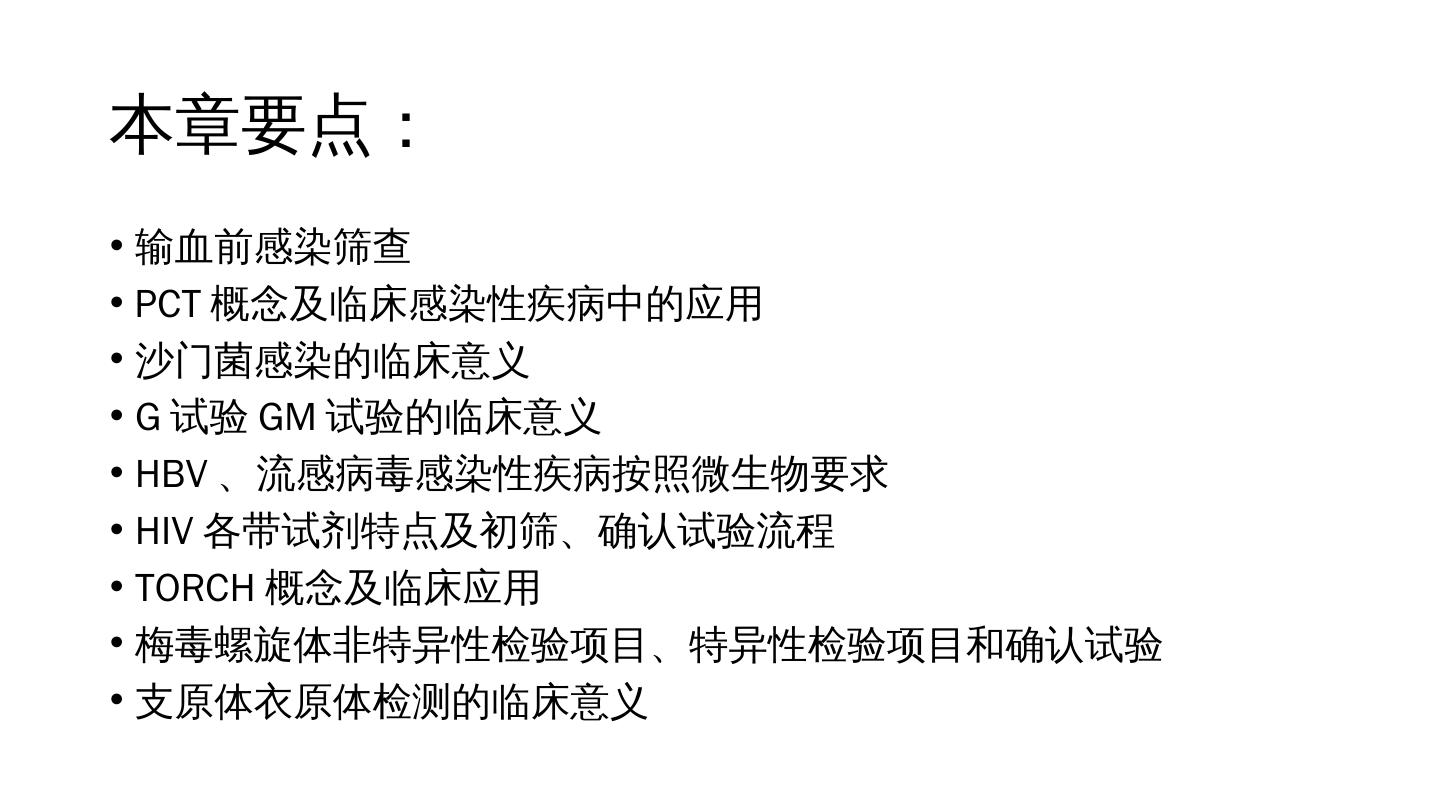 8 .本章要点: 输血前感染筛查 PCT 概念及临床感染性疾病中的应用 沙门菌感染的临床意义 G 试验 GM 试验的临床意义 HBV 、流感病毒感染性疾病按照微生物要求 HIV 各带试剂特点及初筛、确认试验流程 TORCH 概念及临床应用 梅毒螺旋体非特异性检验项目、特异性检验项目和确认试验 支原体衣原体检测的临床意义