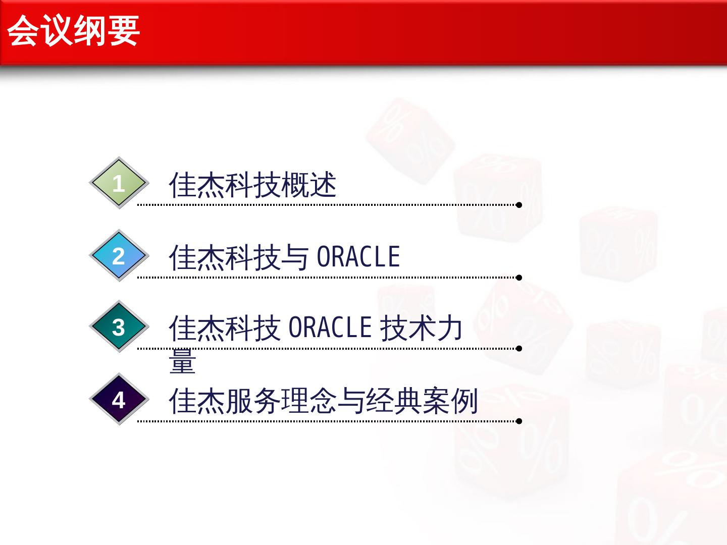2 .会议纲要 佳杰科技概述 1 佳杰科技与 ORACLE 2 佳杰科技 ORACLE 技术力量 3 佳 杰服务理念 与经典案例 4