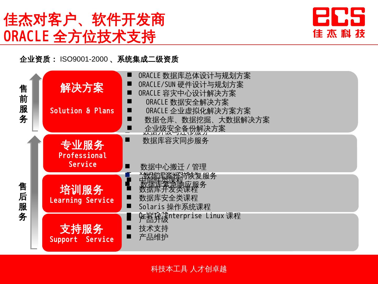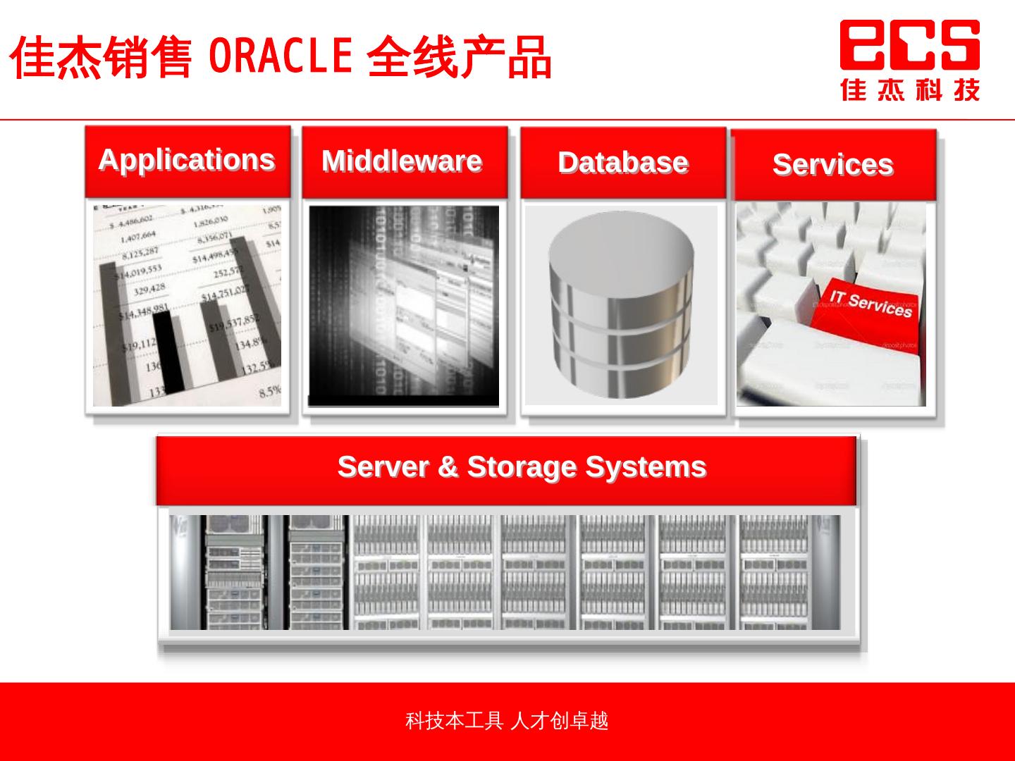 9 .Services 佳杰销售 ORACLE 全线产品 科技本工具 人才创卓越 Server & Storage Systems Applications Middleware Database