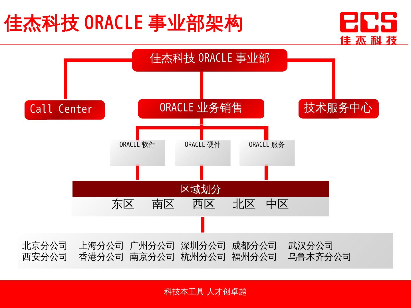 10 .佳杰科技 ORACLE 事业部架构 科技本工具 人才创卓越 佳杰科技 ORACLE 事业部 ORACLE 业务销售 技术服务中心 ORACLE 软件 ORACLE 硬件 ORACLE 服务 Call Center 东区 南区 西区 北区 中区 区域划分 北京分公司 上海 分公司 广州分公司 深圳分公司 成都分公司 武汉分公司 西安分公司 香港分公司 南京分公司 杭州分公司 福州分公司 乌鲁木齐分公司
