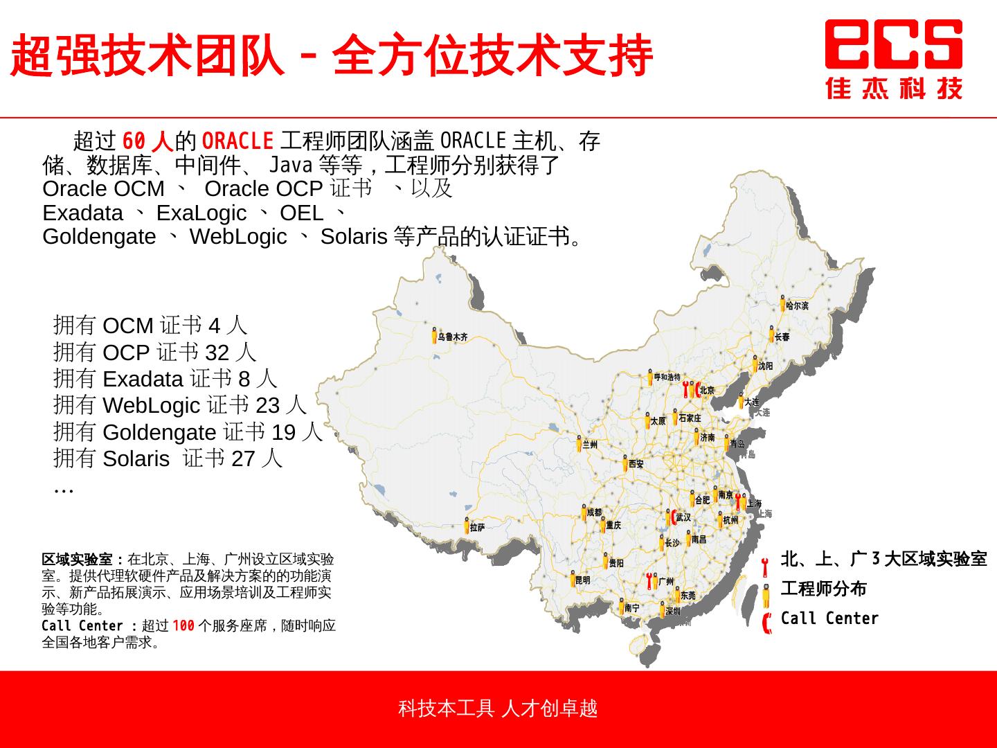 14 .超强技术团队 - 全方位技术支持 超过 6 0 人 的 ORACLE 工程 师团队 涵盖 ORACLE 主机 、存储 、数据库、中间件、 Java 等等,工程 师 分别 获得 了 Oracle OCM 、 Oracle OCP 证书 、以及 Exadata 、 ExaLogic 、 OEL 、 Goldengate 、 WebLogic 、 Solaris 等产品的 认证证书。 区域实验室: 在北京、上海、广州设立区域实验室。提供代理 软硬件产品及解决方案的的功能演示、新产品拓展演示、应用场景培训及工程师实验等功能。 Call Center : 超过 100 个服务座席,随时响应全国各地客户需求。 北、上、广 3 大区域 实验室 工程师分布 Call Center 科技本工具 人才创卓越 拥有 OCM 证书 4 人 拥有 OCP 证书 32 人 拥有 Exadata 证书 8 人 拥有 WebLogic 证书 23 人 拥有 Goldengate 证书 19 人 拥有 Solaris 证书 27 人 …
