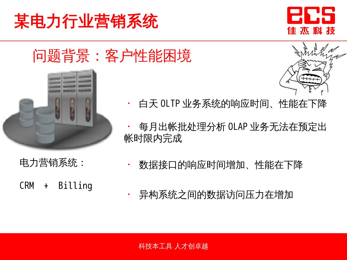 18 .科技本工具 人才创卓越 问题背景:客户性能困境 电力营销系统: CRM + Billing 某电力行业营销系统 • 白天 OLTP 业务 系统的响应时间、性能在下降 • 每月出帐批处理分析 OLAP 业务 无法在预定出帐时限内完成 • 数据接口 的响应时间 增加 、 性能在下降 • 异构系统之间的数据访问压力在增加