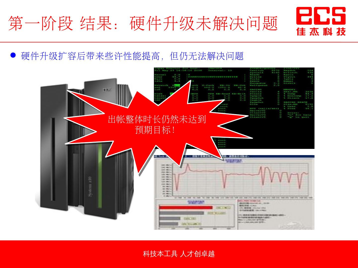 22 .科技本工具 人才创卓越 第一阶段 结果:硬件升级未解决问题 出帐整体时长仍然 未达到 预期目标! 硬件升级扩容后带来些许性能提高,但仍无法解决问题