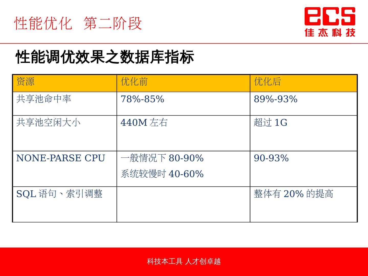 25 .科技本工具 人才创卓越 性能优化 第二阶段 资源 优化前 优化后 共享池命中率 7 8%- 85 % 8 9%-9 3 % 共享池空闲大小 44 0M 左右 超过 1G NONE-PARSE CPU 一般情况下 80-90% 系统较慢时 40-60% 90-93% SQL 语句、索引调整 整体有 20% 的提高 性能调优效果 之 数据库 指标