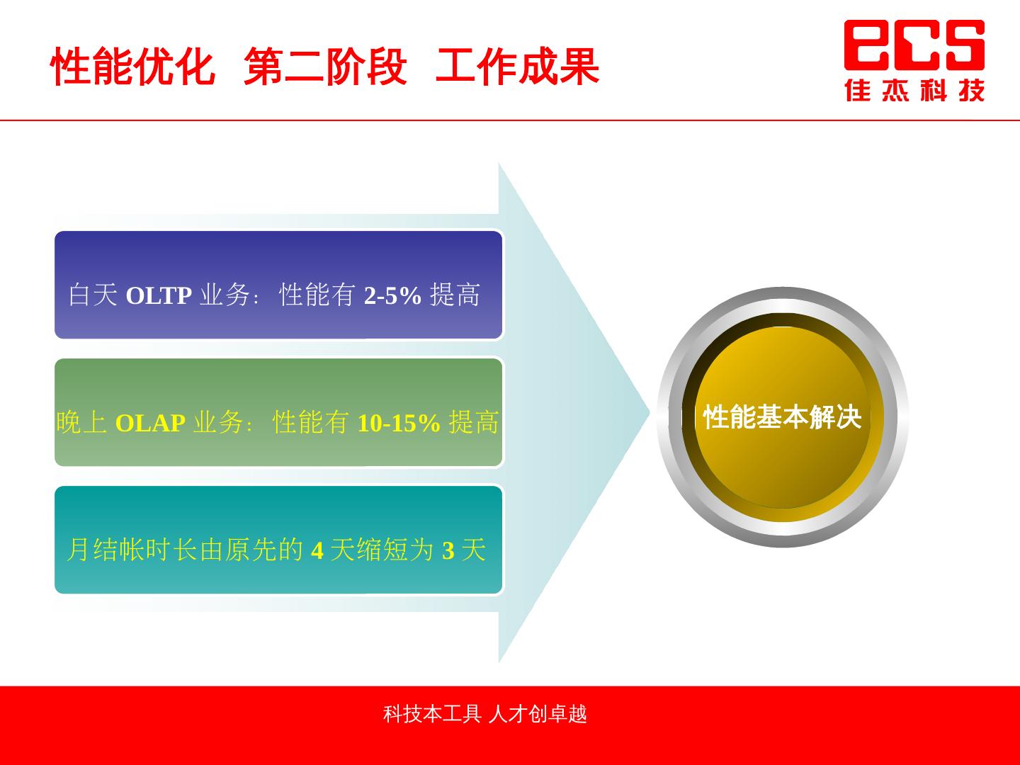 27 .科技本工具 人才创卓越 性能优化 第二阶段 工作成果 白天 OLTP 业务:性能有 2-5% 提高 晚上 OLAP 业务:性能有 10-15% 提高 月结帐时长由原先的 4 天缩短为 3 天 性能基本解决