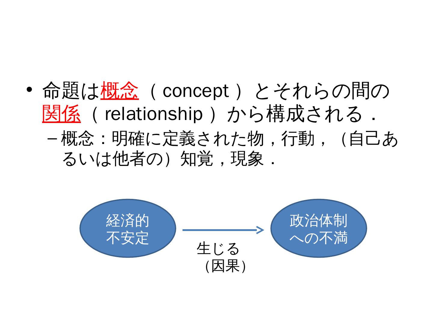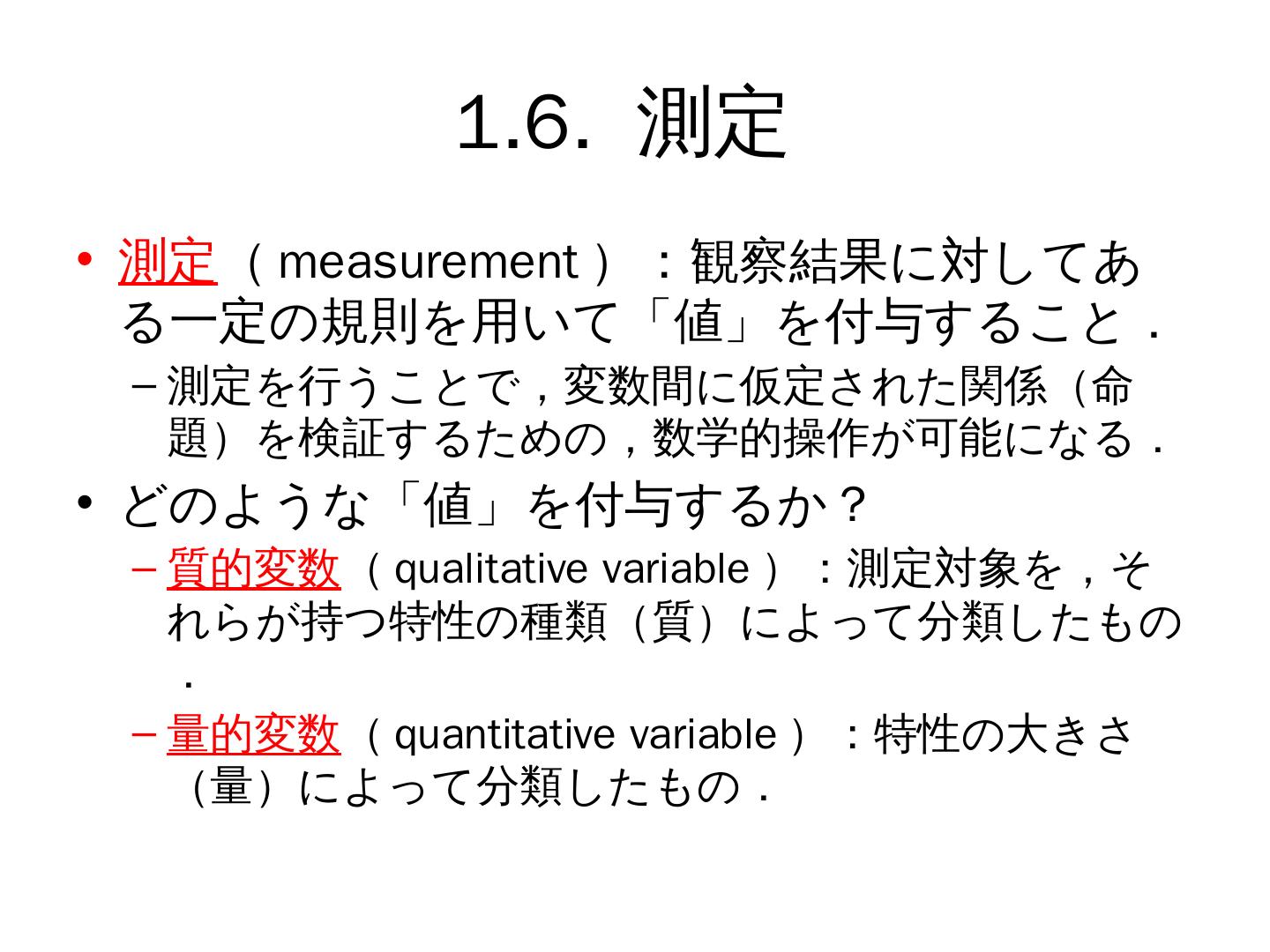測定を行うことで,変数間に仮定された関係(命題)を検証するための,数学的操作が可能になる. どのような「値」を ... 離散型変数(discrete variable):整数値のみをとる.