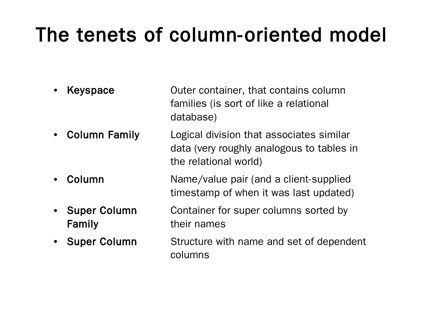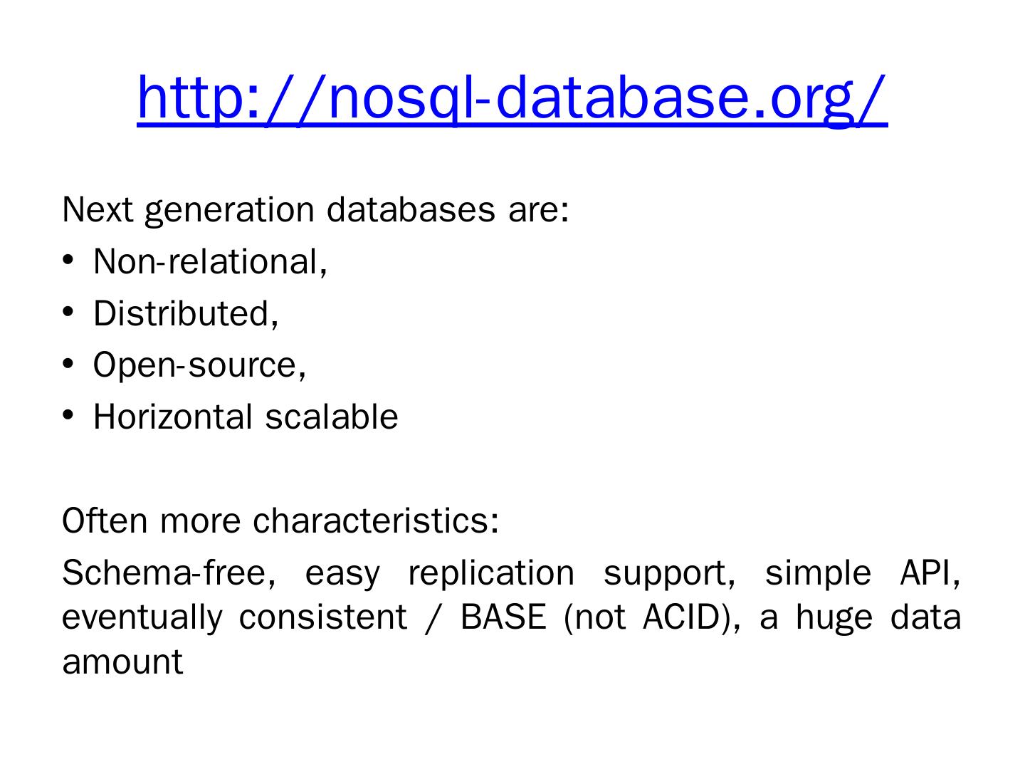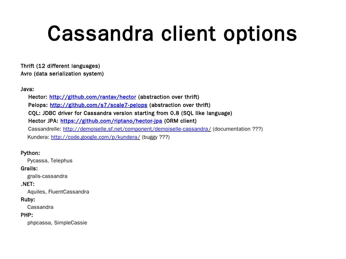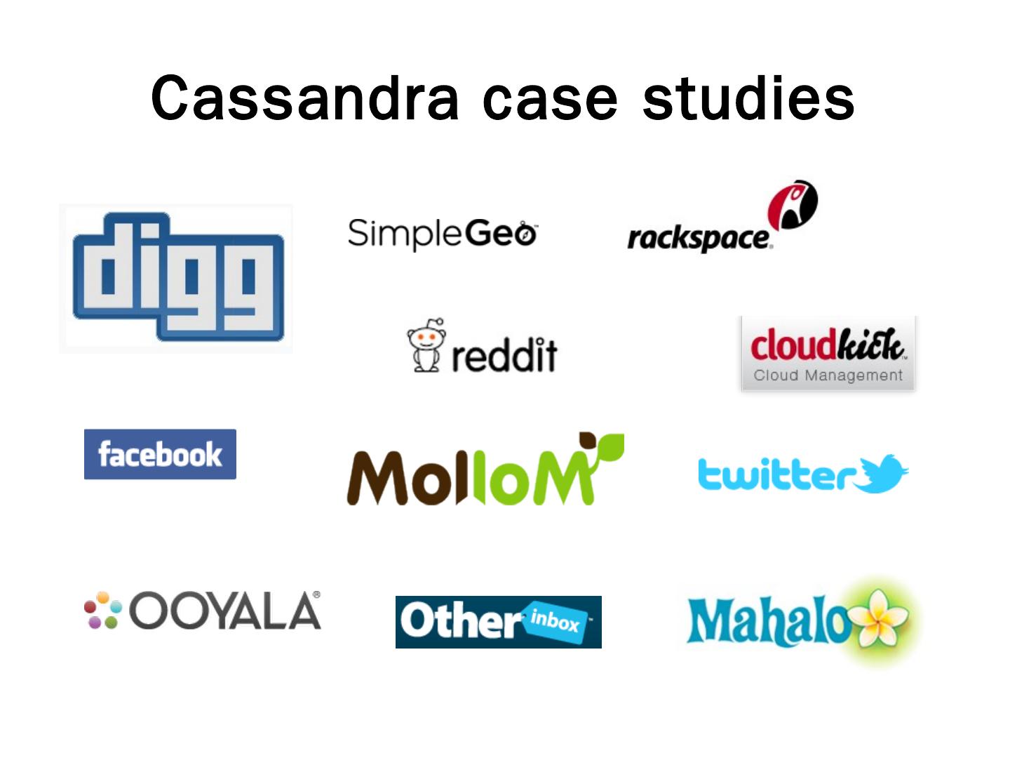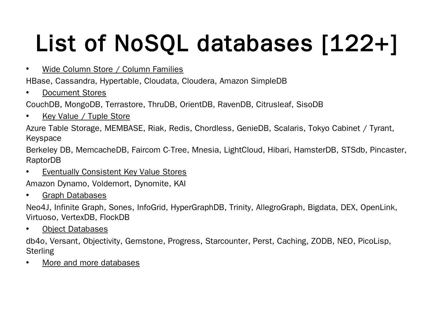 HBase, Cassandra, Hypertable, Cloudata, Cloudera, Amazon SimpleDB. Document Stores. CouchDB, MongoDB, Terrastore, ThruDB, OrientDB, RavenDB, ...