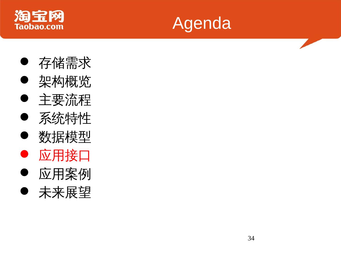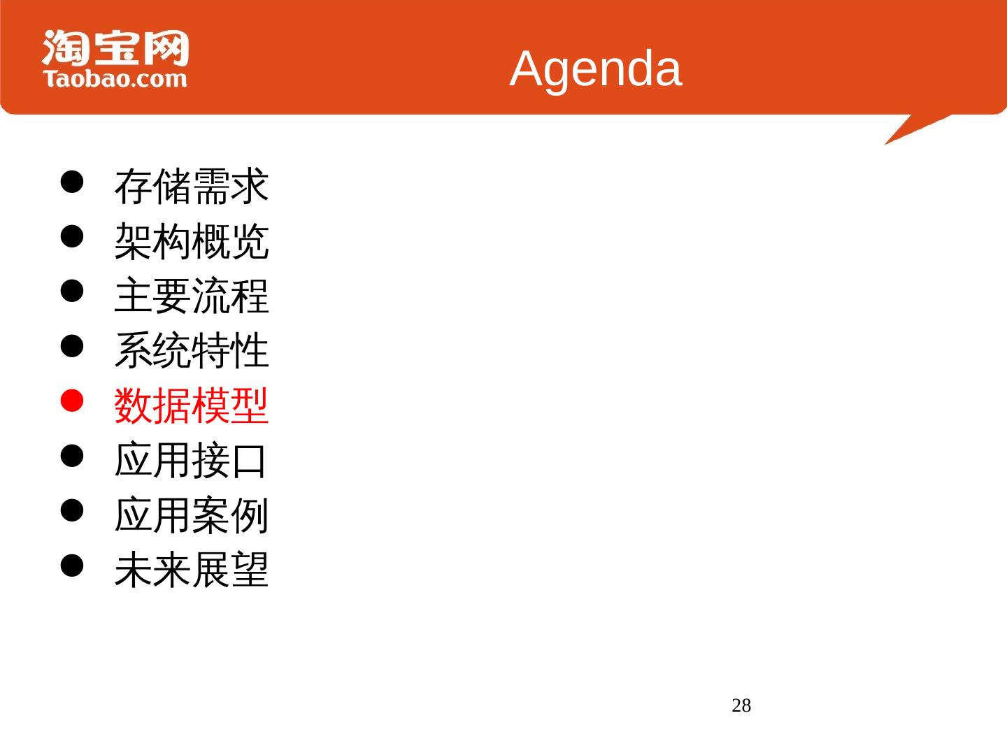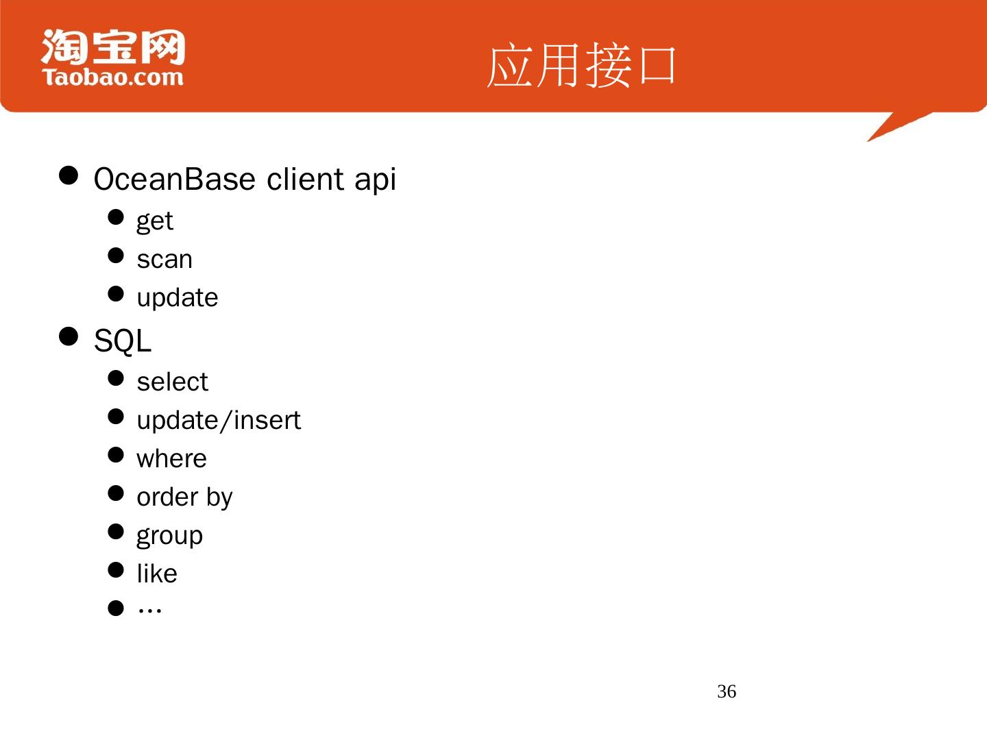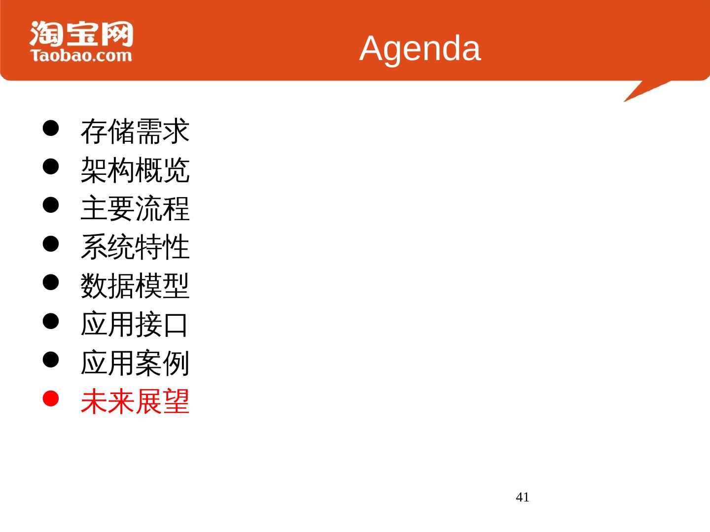 OceanBase internals. 2011.6. TaoBao-CoreSystem-Storage. qushan. 1. 存储需求; 架构概览; 主要流程; 系统特性; 数据模型; 应用接口; 应用案例; 未来展望. 2.