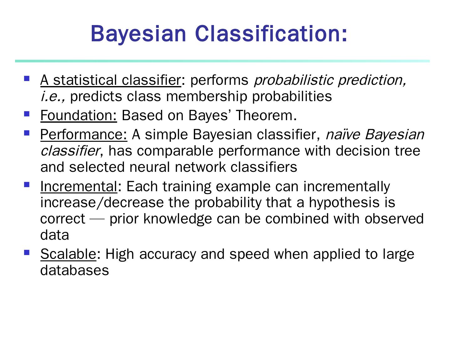 Performance: A simple Bayesian classifier, naïve Bayesian classifier, has comparable performance with decision tree and selected neural network classifiers ...