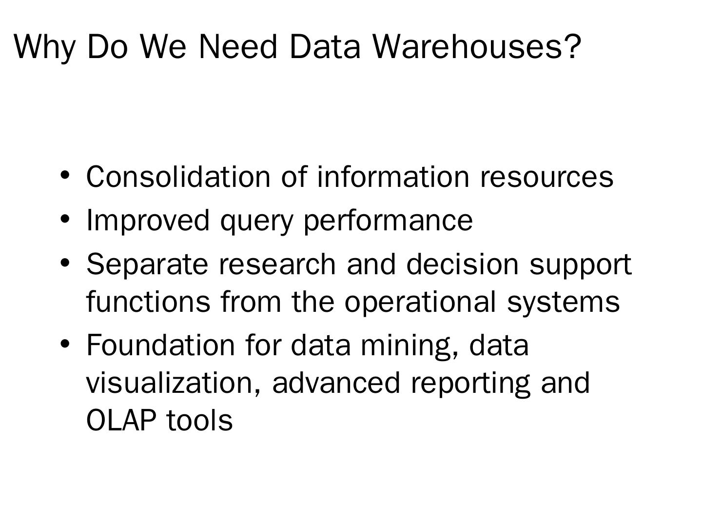 4 .Why Do We Need Data Warehouses? Consolidation of information resources Improved query performance Separate research and decision support functions from the operational systems Foundation for data mining, data visualization, advanced reporting and OLAP tools