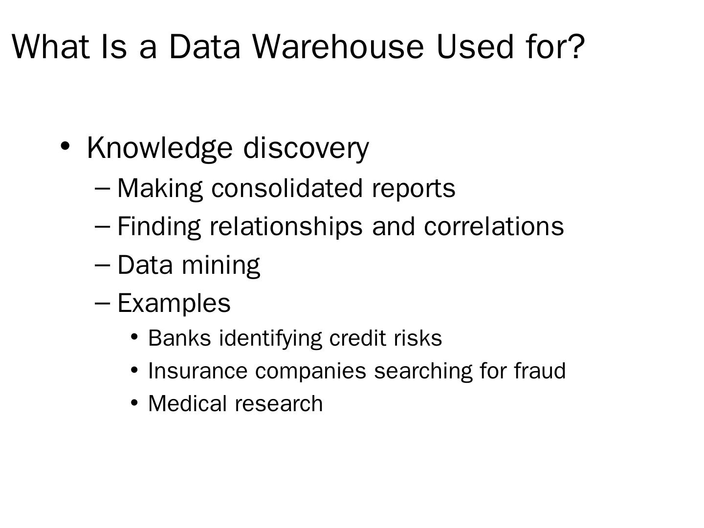 6 .What Is a Data Warehouse Used for? Knowledge discovery Making consolidated reports Finding relationships and correlations Data mining Examples Banks identifying credit risks Insurance companies searching for fraud Medical research