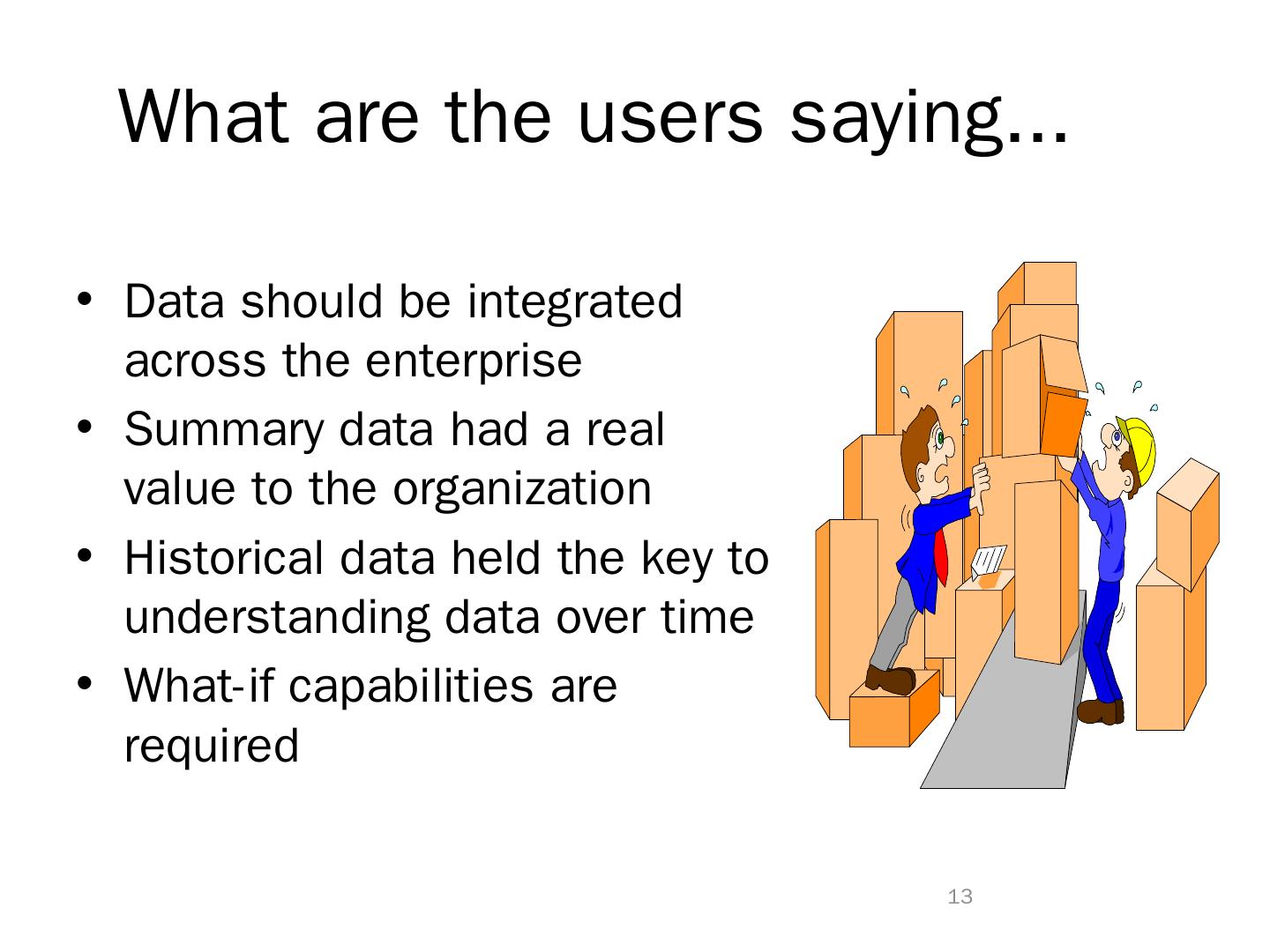 13 .13 What are the users saying... Data should be integrated across the enterprise Summary data had a real value to the organization Historical data held the key to understanding data over time What-if capabilities are required