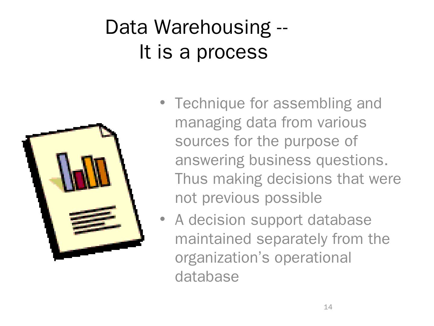 14 .14 Data Warehousing -- It is a process Technique for assembling and managing data from various sources for the purpose of answering business questions. Thus making decisions that were not previous possible A decision support database maintained separately from the organization’s operational database