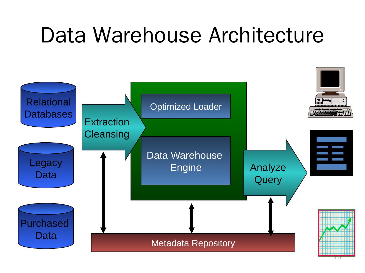 15 .15 Data Warehouse Architecture Relational Databases Legacy Data Purchased Data Data Warehouse Engine Optimized Loader Extraction Cleansing Analyze Query Metadata Repository