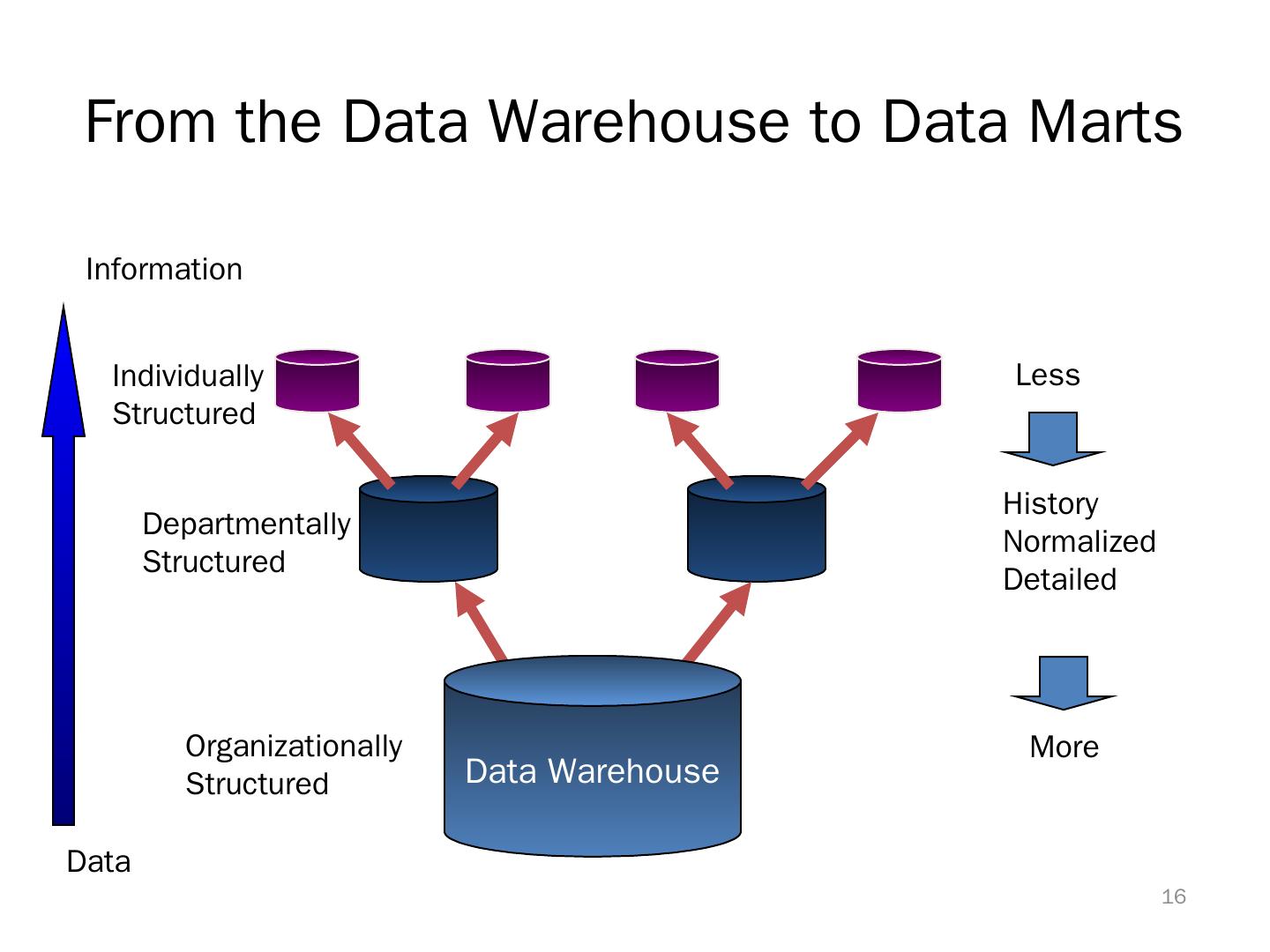 16 .16 From the Data Warehouse to Data Marts Departmentally Structured Individually Structured Data Warehouse Organizationally Structured Less More History Normalized Detailed Data Information