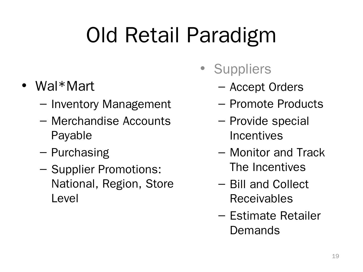 19 .19 Old Retail Paradigm Wal *Mart Inventory Management Merchandise Accounts Payable Purchasing Supplier Promotions: National, Region, Store Level Suppliers Accept Orders Promote Products Provide special Incentives Monitor and Track The Incentives Bill and Collect Receivables Estimate Retailer Demands