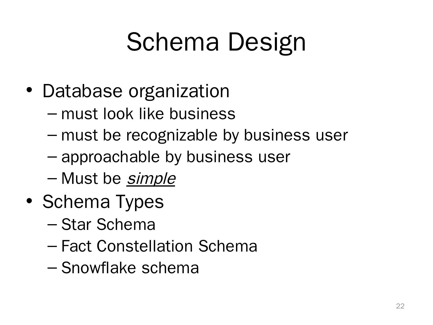 22 .22 Schema Design Database organization must look like business must be recognizable by business user approachable by business user Must be simple Schema Types Star Schema Fact Constellation Schema Snowflake schema