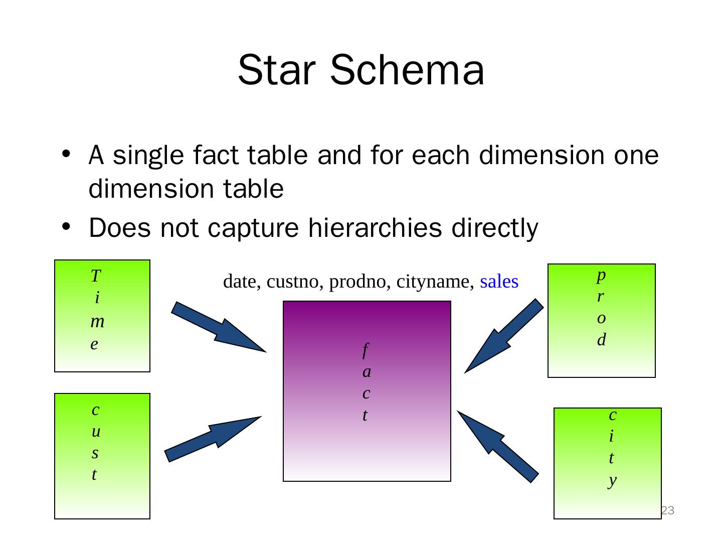 23 .23 Star Schema A single fact table and for each dimension one dimension table Does not capture hierarchies directly T i m e p r o d c u s t c i t y f a c t date, custno, prodno, cityname, sales