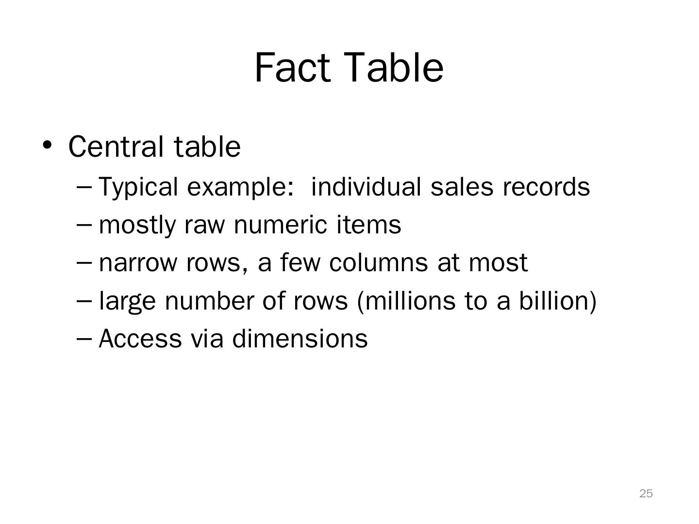 25 .25 Fact Table Central table Typical example: individual sales records mostly raw numeric items narrow rows, a few columns at most large number of rows (millions to a billion) Access via dimensions
