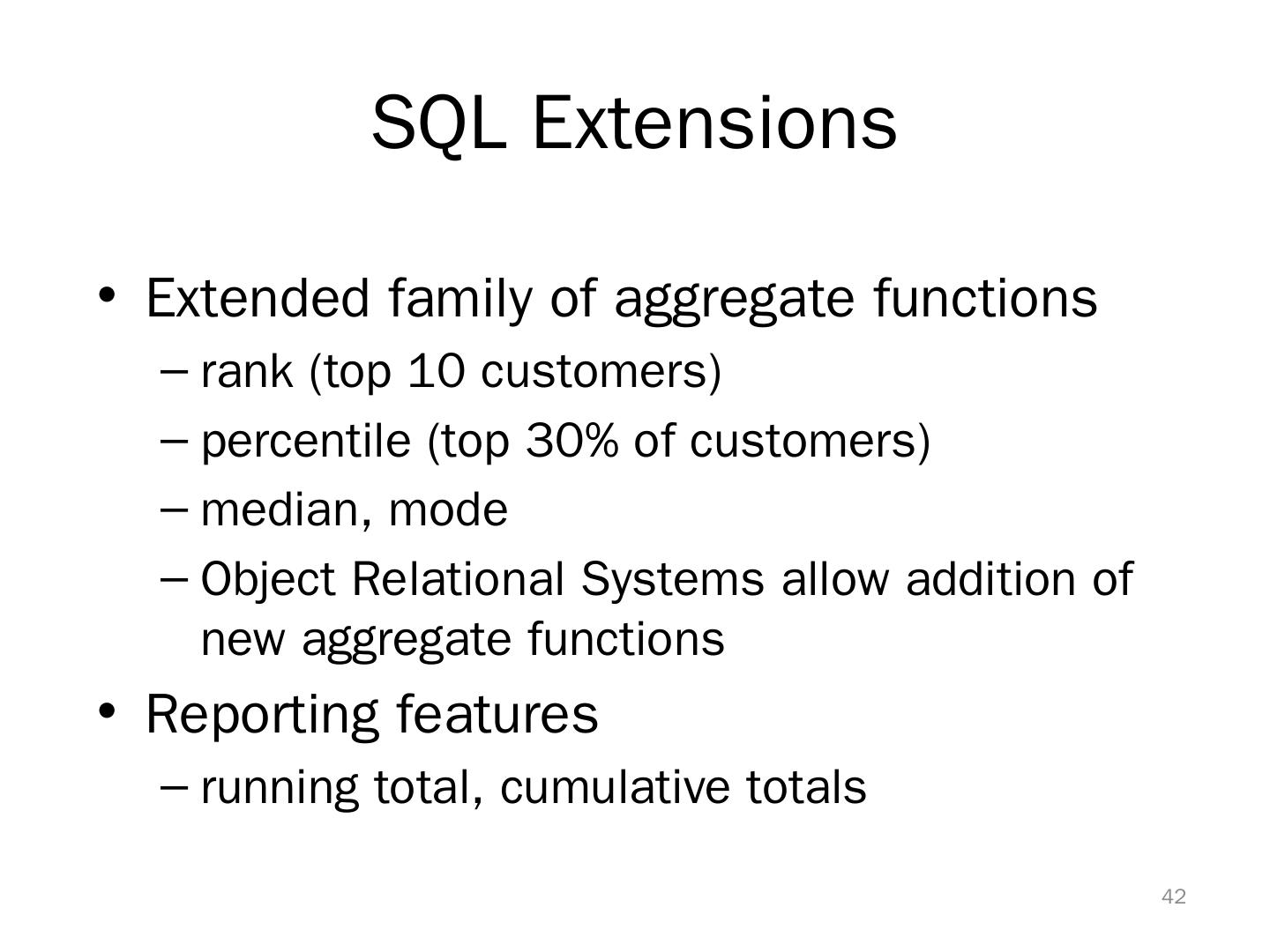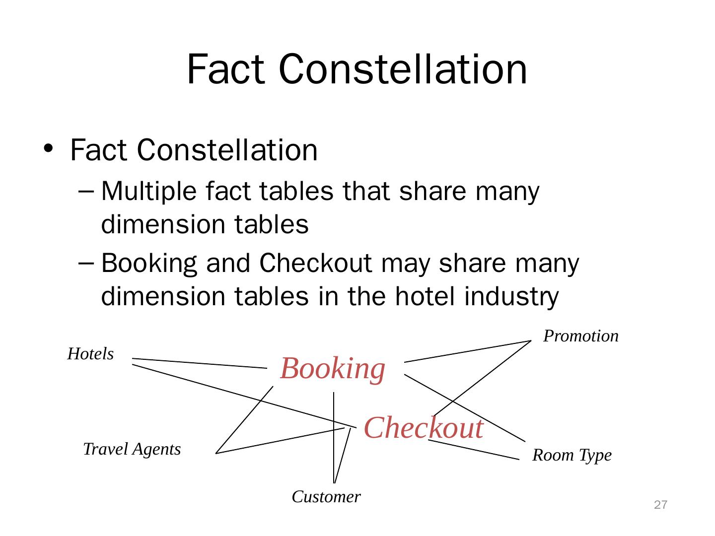 27 .27 Fact Constellation Fact Constellation Multiple fact tables that share many dimension tables Booking and Checkout may share many dimension tables in the hotel industry Hotels Travel Agents Promotion Room Type Customer Booking Checkout